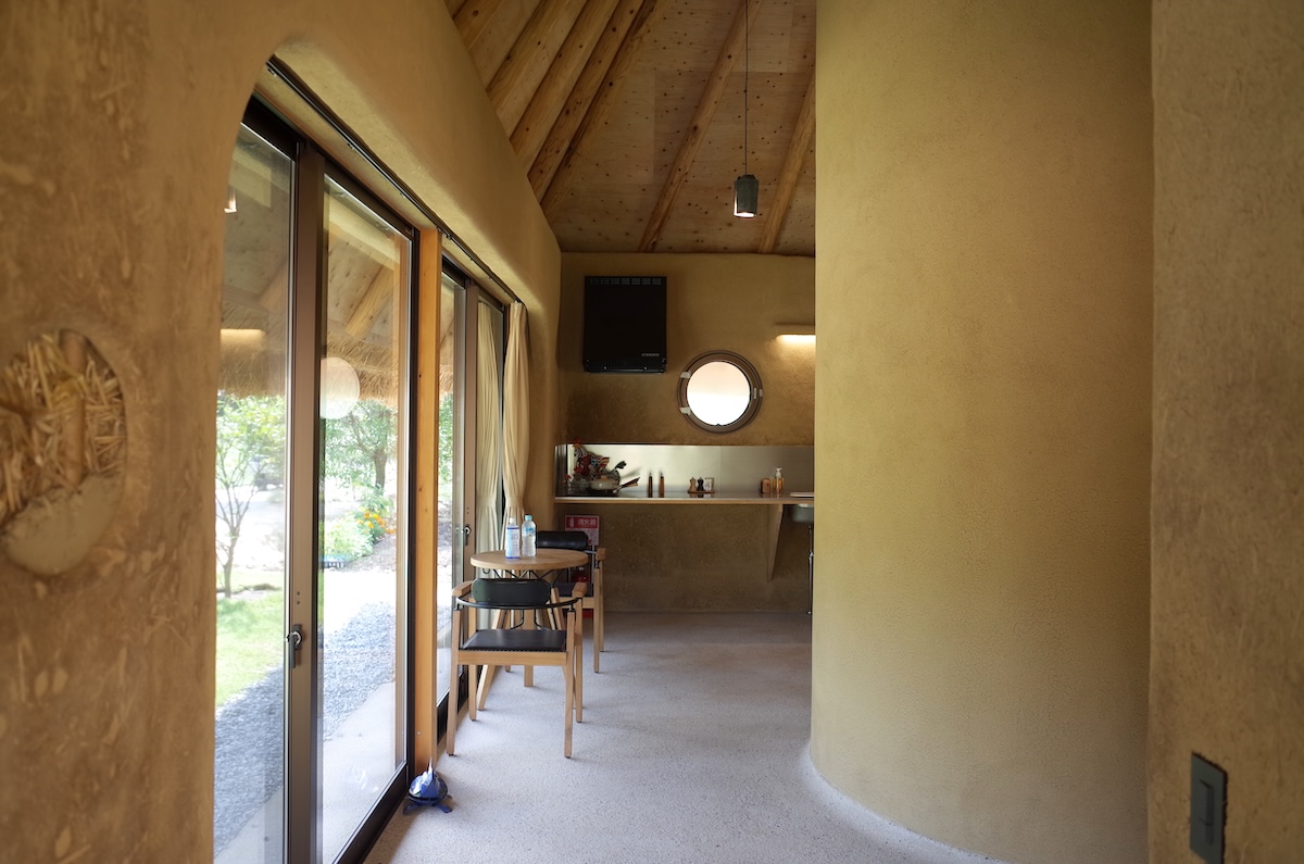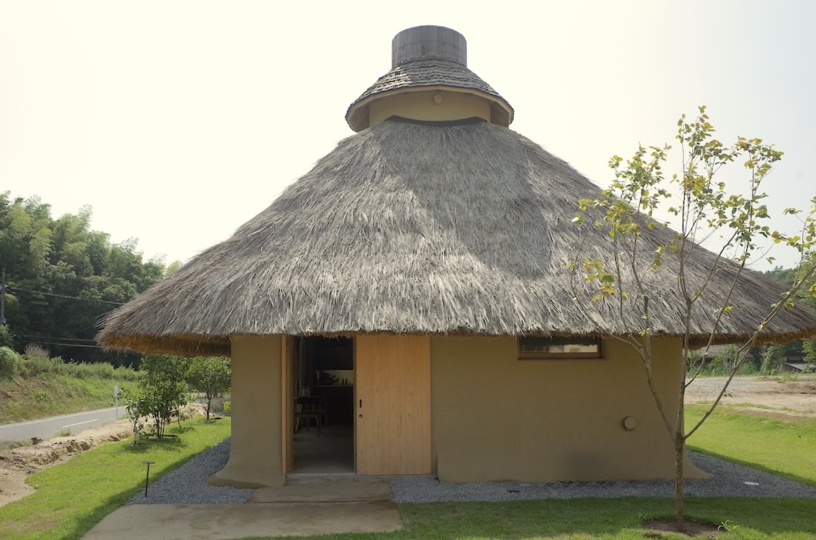 ▶︎土着の素材である淡路島の暮らしから生まれる土・竹・藁などを使用してつくられた土茅庵。中央に据えられた土の塔(浴室)が空間を緩やかに分設しつつ、藁と竹と土でできた壁が全体をやわらかく包み込み、ひと続きの空間になっている。壁はストローベイルという藁を圧縮したブロック状のものが竹で緊結されており、土で表面が仕上げられ、地面がそのまま立ち上がったような意匠となっている。