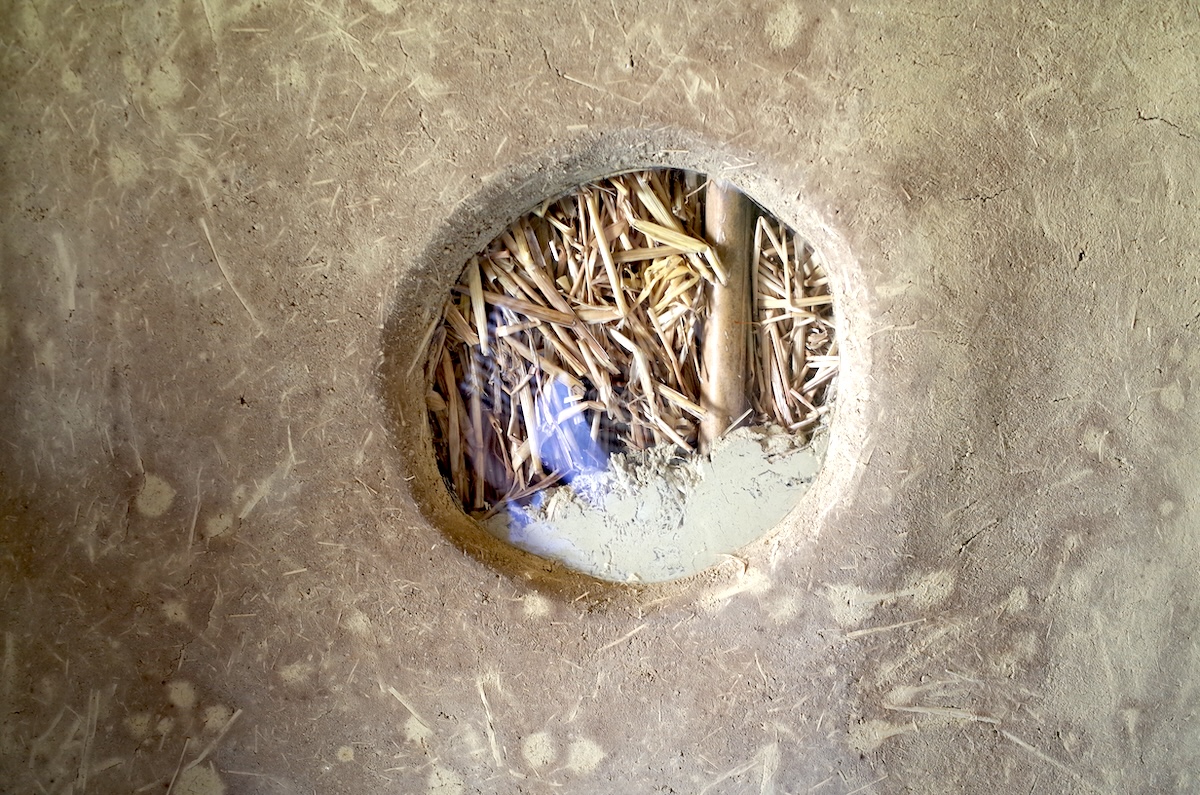 入り口左側の壁の一部が空けられており、壁の構造であるストローベイルが見える。
