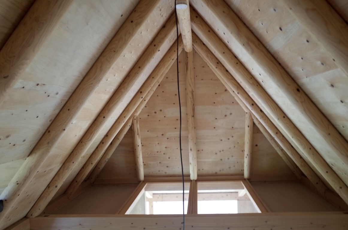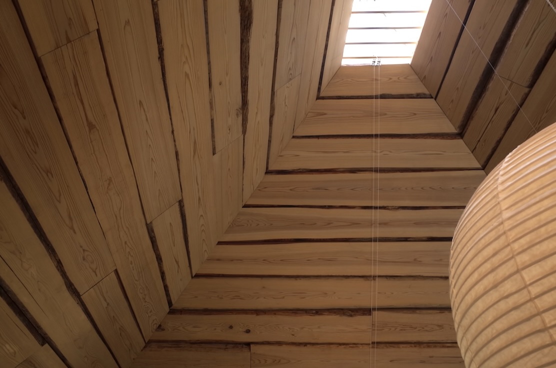 屋根まで積み上がられた丸太。上部には採光を調整できるシェイドがある。