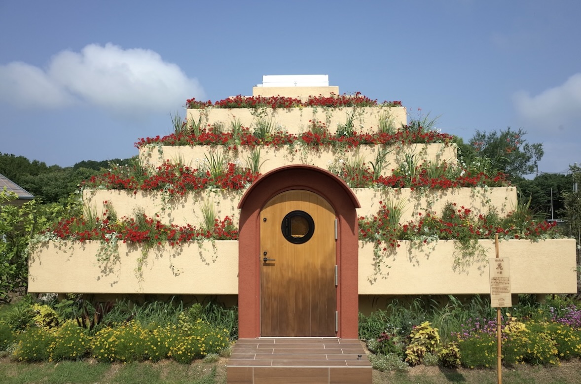 ▶︎外壁が花で覆われた〈花(花の家 / HANA)〉は、1階フロアを80cm地面より低く設計することで、入り口から地中に入り込むような空間体験になっている。「花に覆われた花の山をイメージさせる建物」をという依頼に対し、ピラミッド型を採用し、段差には草花が植えられ、灌水装置が仕込まれており、草花を維持する運営にも配慮している。また建物をピラミッド型にすることで、屋根の勾配が段々になっており、天井高を確保するとともに、開口を設け外への視線も作っている。