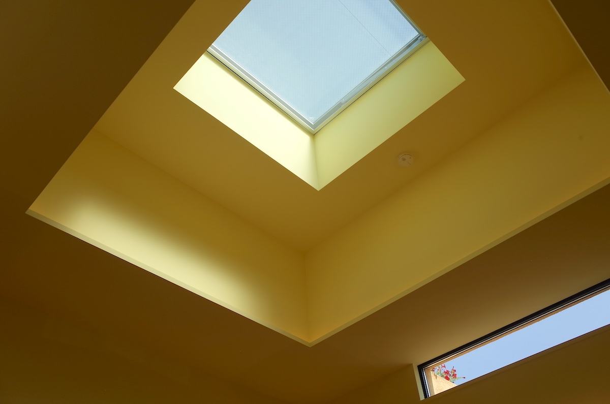 入り口側より建物を見る。周辺環境を室内に取り込む上部の窓。