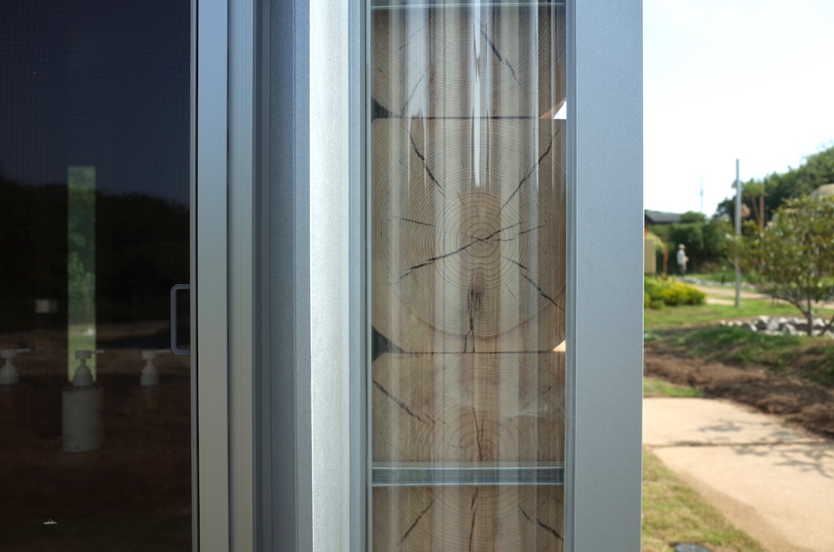 ▶︎立体的に積み上げた窓から構成されたL字のボリュームと、自然素材であるコルクで構成されたL字ボリュームが、2つ向かい合う形で構成されている建築。この2つのボリュームが対峙し、混ざり合うことで、小さな家の中にも、多様なスケールと畑や森林・周囲の自然との関係性を作り出している。窓で構成されたL字のボリュームは外へと開き、コルクで構成されたボリュームは内へと閉じ、居住スペースとなっている。またWB工法* により、夏は壁の中の熱を排出し、冬は外気を遮断して保温効果を高めて織り、機械換気に頼らず、自然の力を利用してながら限られた空間を快適に保っている。
