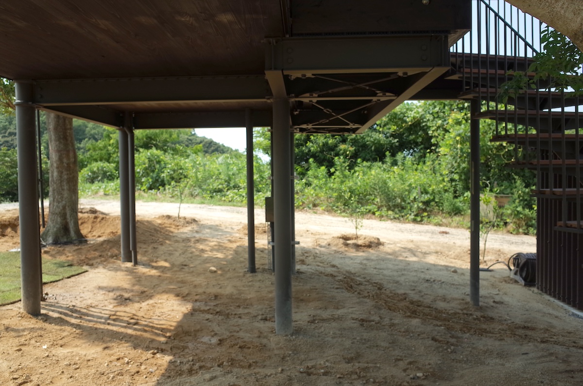 ▶︎草木や虫たちのために大地を開放しつつ、海の眺望を得るための2階建てファームハウス。2つのコンテナでボリュームを構成し、直行させることで敷地の多方面に眺望をつくる。上のボリュームの開口は、夏至の日の入りと、冬至の日の出の方向に設けられており、農業における季節の移り変わり、太陽の動き、時間の流れの重要性を、建築に取り入れている。束基礎で建物を持ち上げ、大地を自然に開放している。