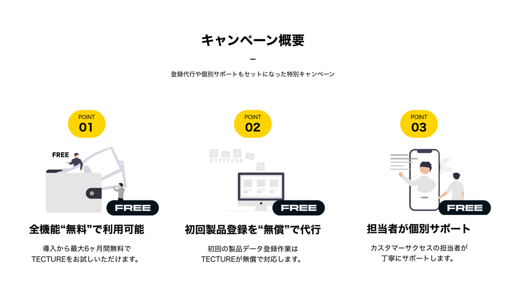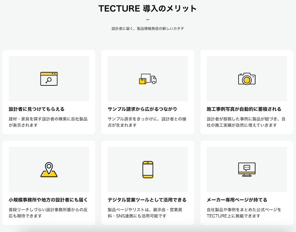 本キャンペーンでは、サンプル請求や事例掲載、メーカー専用ページの作成など、TECTUREのすべての機能を最大6ヶ月間無料でご利用いただけます。