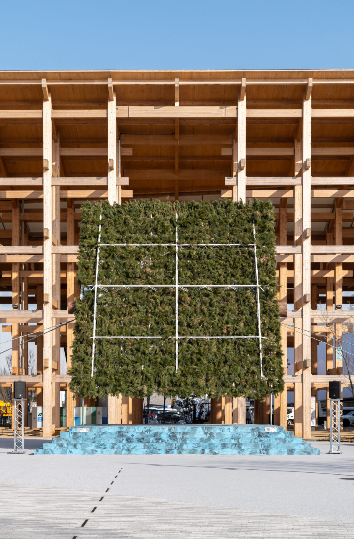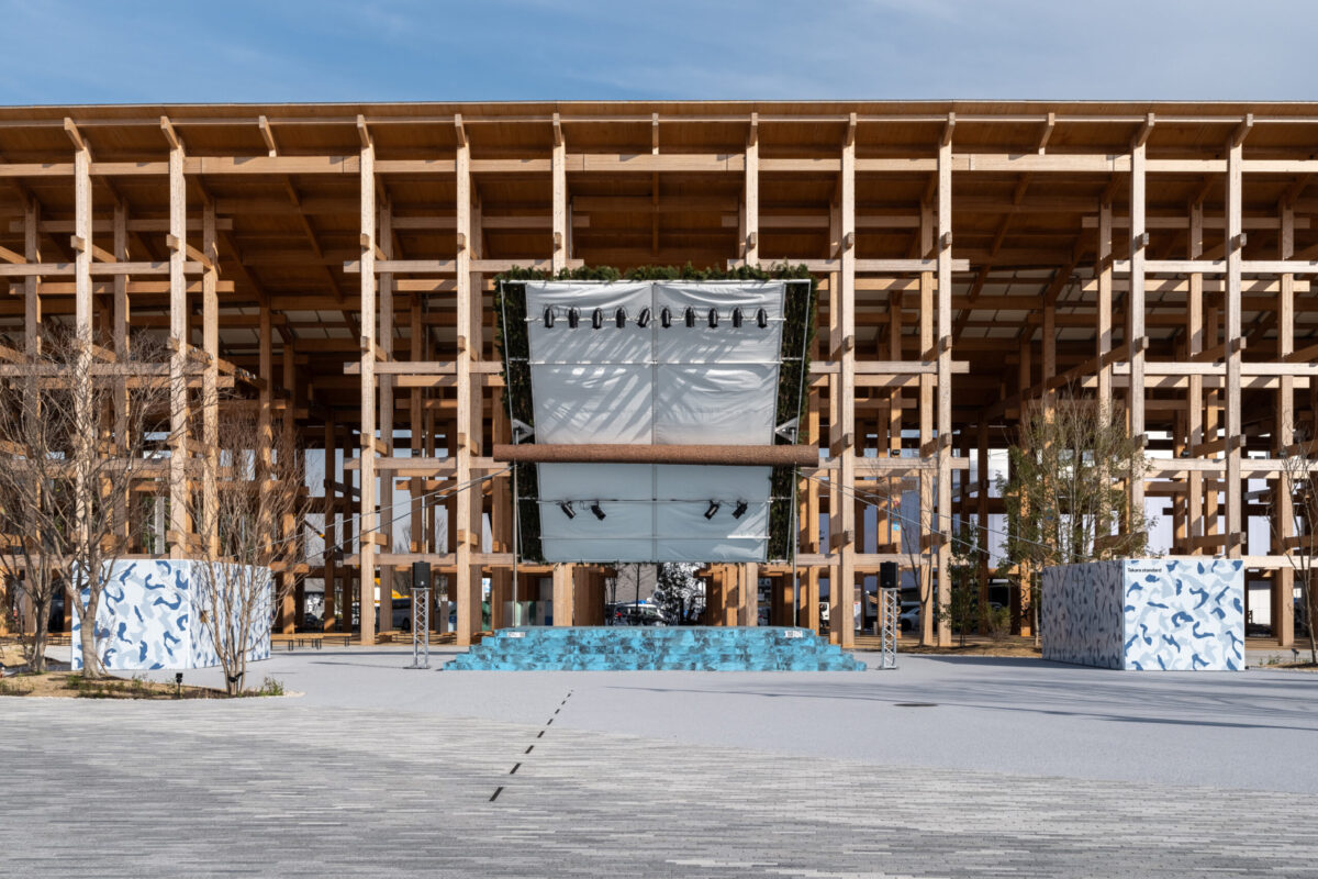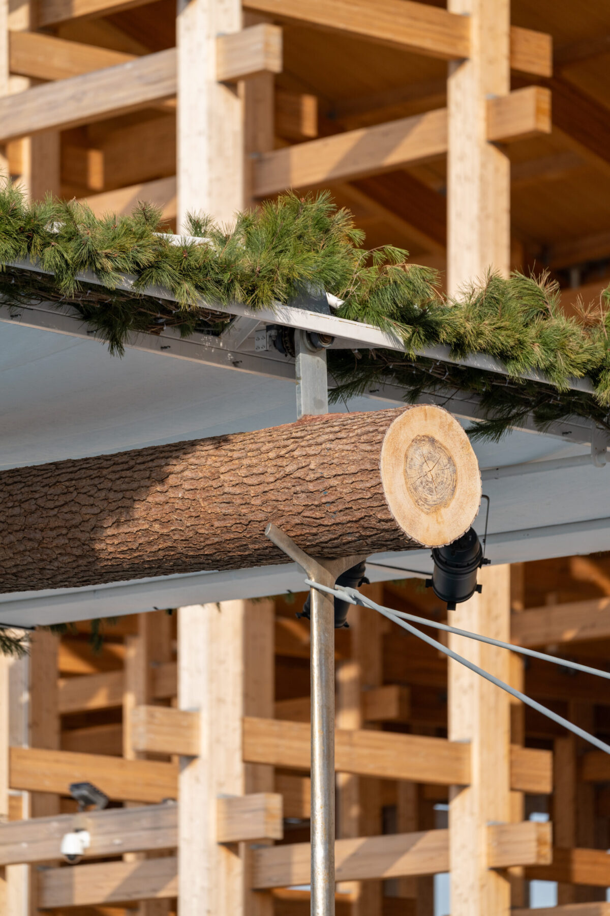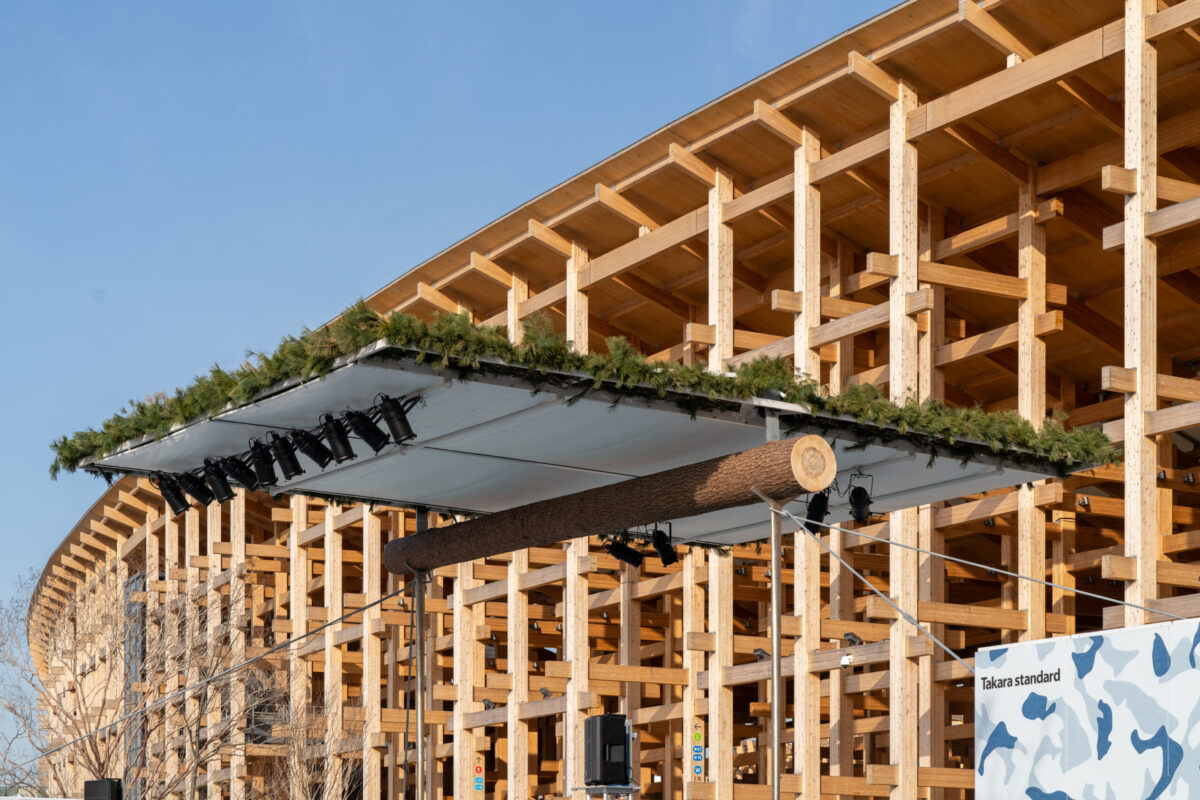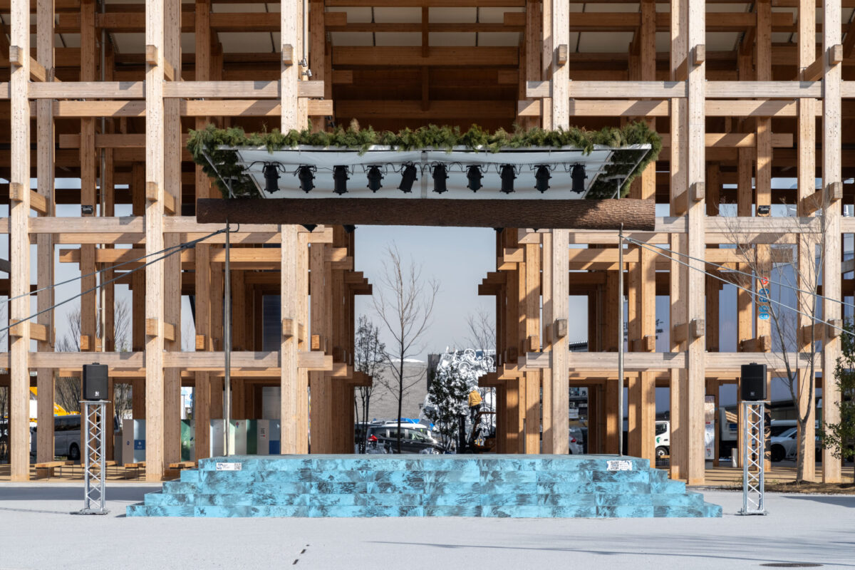 〈ポップアップステージ 西〉では、装飾を施された細い柱と、その柱に支えられる存在感のある松の丸太による門型の構成が特徴です。伝統的な祝祭の形式を参照しつつ、構成の原点に立ち返った表現によって、人々を自然と惹きつける祝祭の場をつくり出しています。