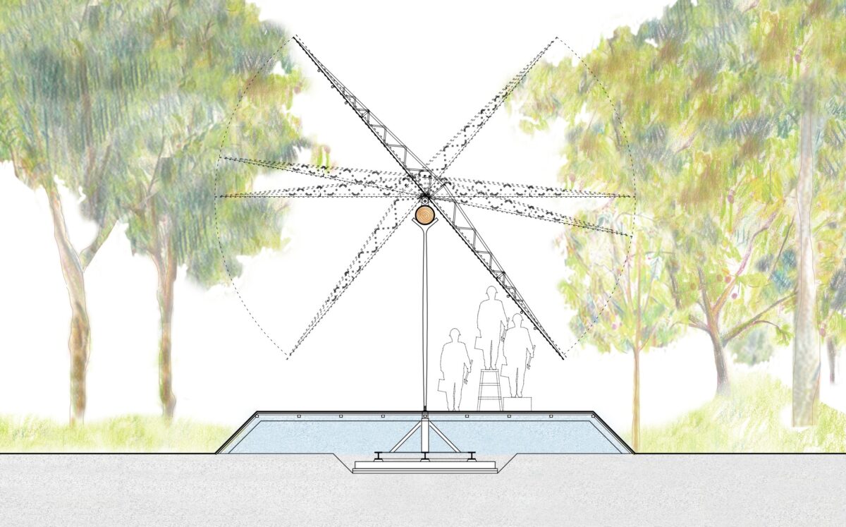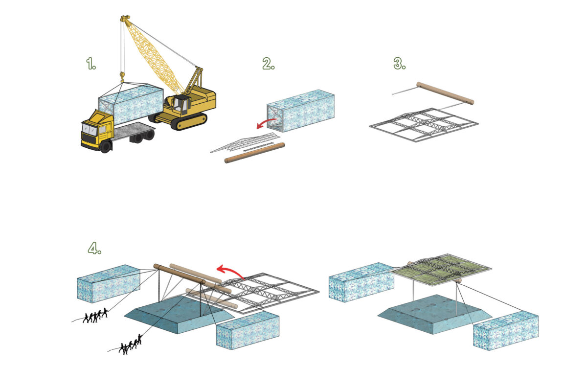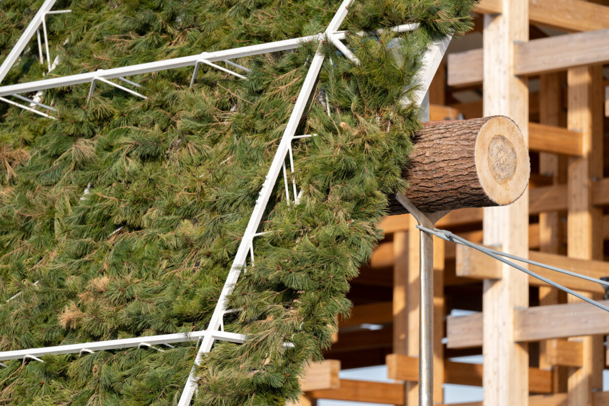 伐り、伏せ、高く掲げる——それだけで、力強い場が立ち上がります。屋根には、生の松葉を使いました。屋根はシーソーのように動き、舞台装置としても機能します。この動きにより、建築という枠を超えて、”装置”として認識され、やはり丸太の存在感が浮かび上がります。
