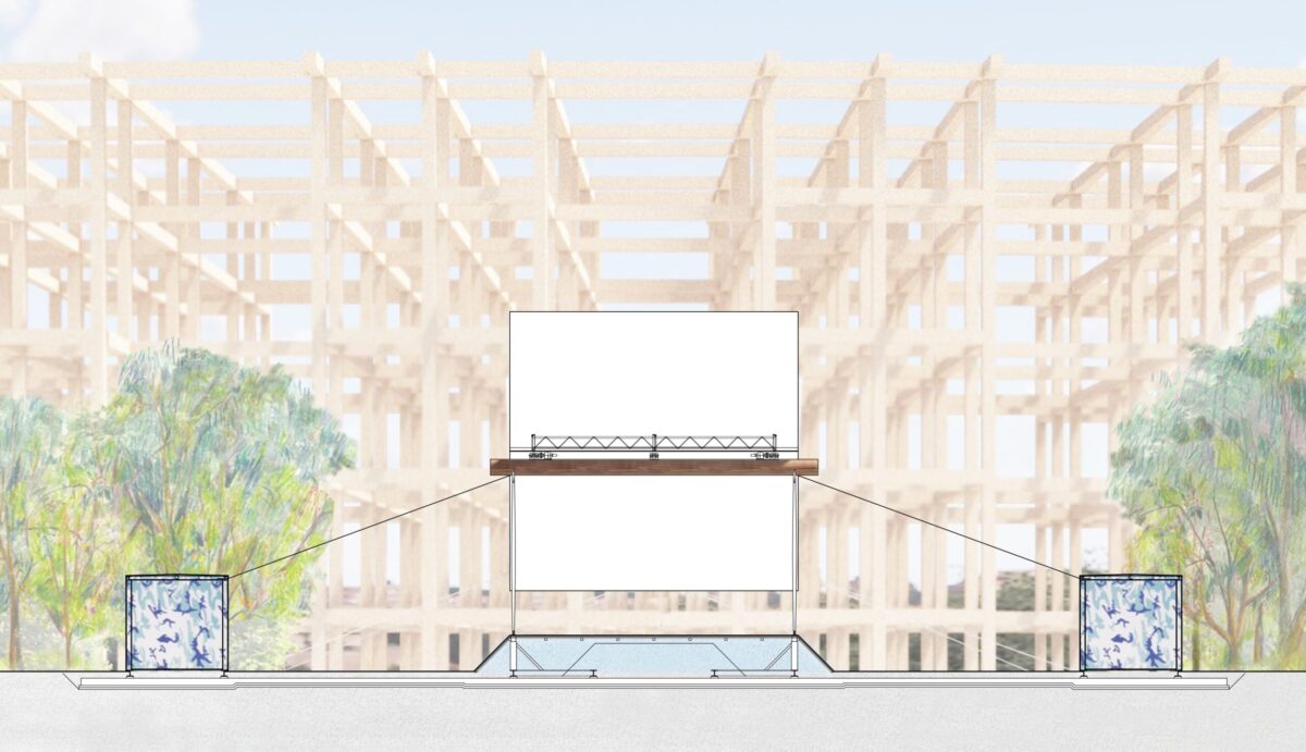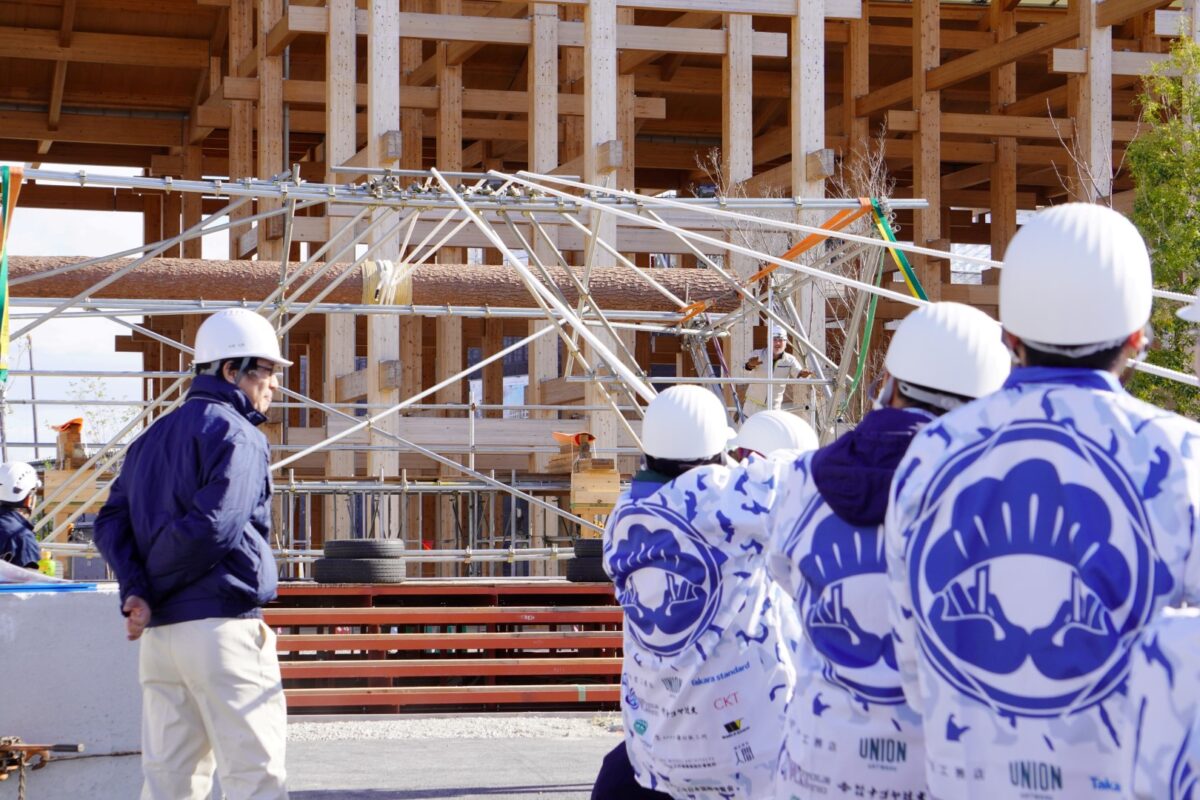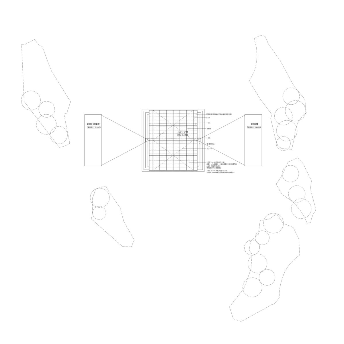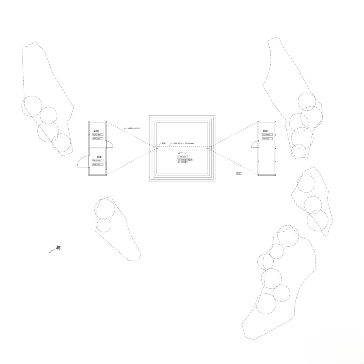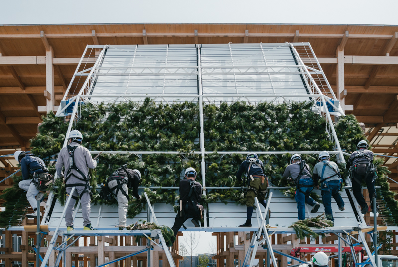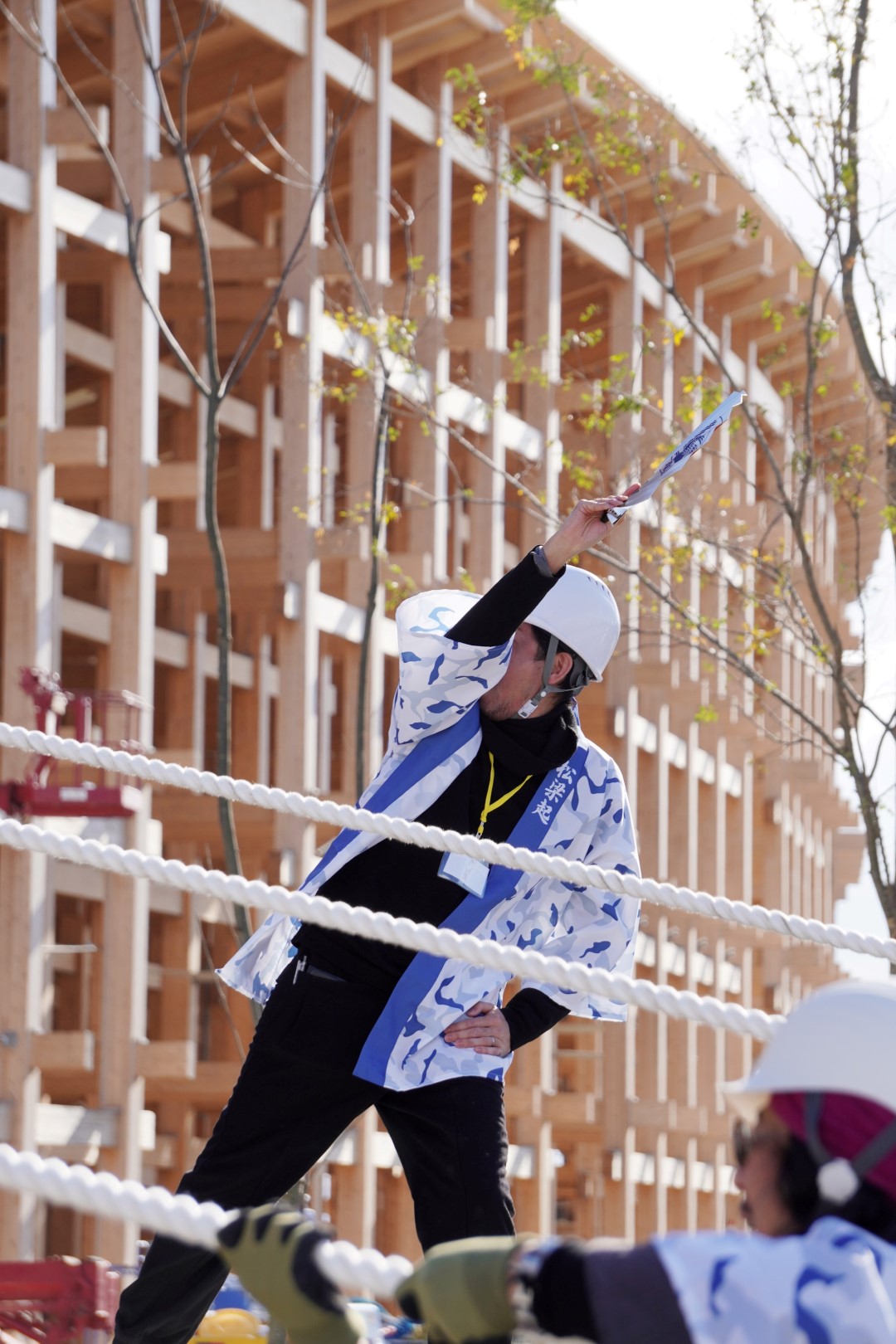 これらの構成は、祇園祭の山鉾建てや、春日大社おん祭の仮御殿といった伝統的な祝祭から学んだものです。人の手によって丸太を建て起こし、屋根を葺く——そうした行為そのものが、場を祝祭へと変えていく。