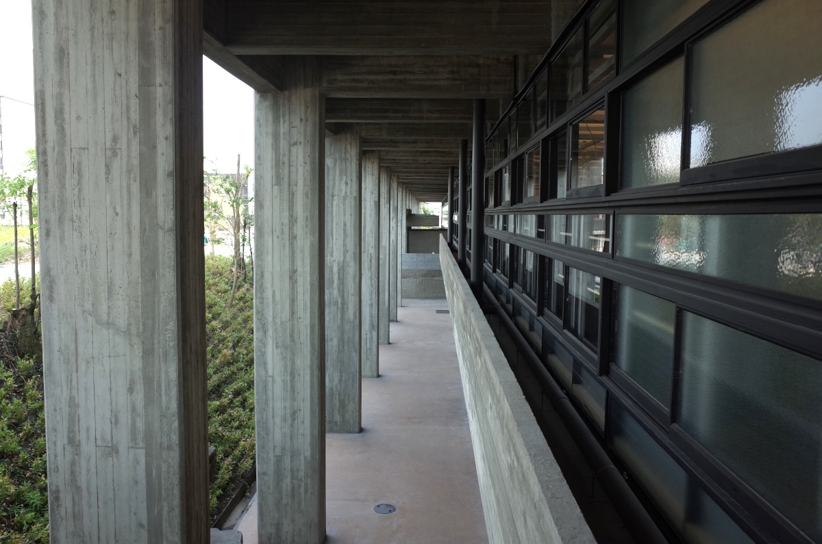打ち放しの列柱や水平連続窓が特徴的な外観
