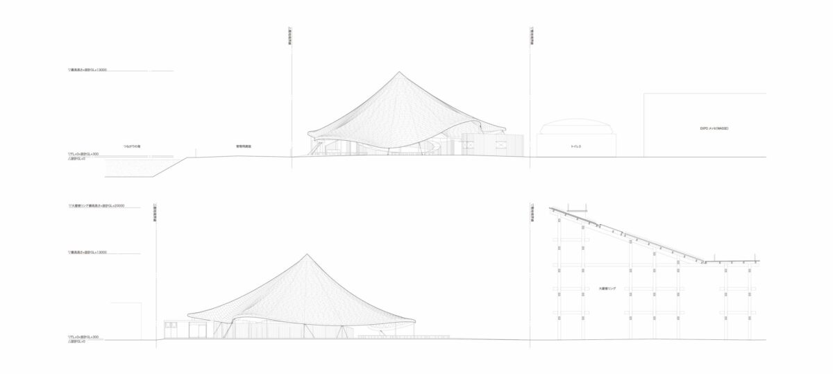 たくさんのパビリオンを忙しく訪れる中で、ふと立ち止まって光の綺麗さに気が付いたり、風を感じたりしながら、万博での体験を反芻する場を目指している。中央の円形の休憩エリア内は、冷気が下からじんわり染みでてくる、触れると涼しいハンモック状の床であり、体を横たえると風で動く屋根のテキスタイルや透過する光を自然と見上げられるようになっている。来場者にとって心地よい日陰をつくり出すとともに、揺れ動く半透明のテキスタイルによって、風の移ろいや光の美しさを感じられる場所となってほしいと考えた。