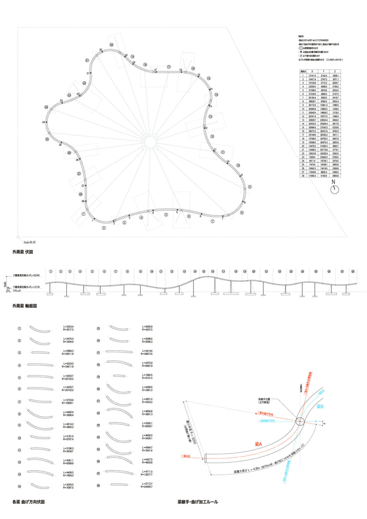外周梁伏図、外周梁組立図、各梁曲げ方向伏図、梁継手・曲げ加工ルール。Image: 大西麻貴+百田有希/o+h