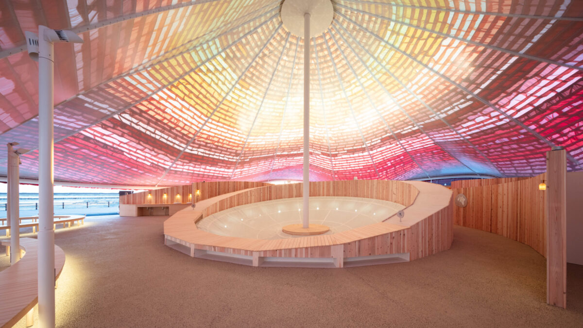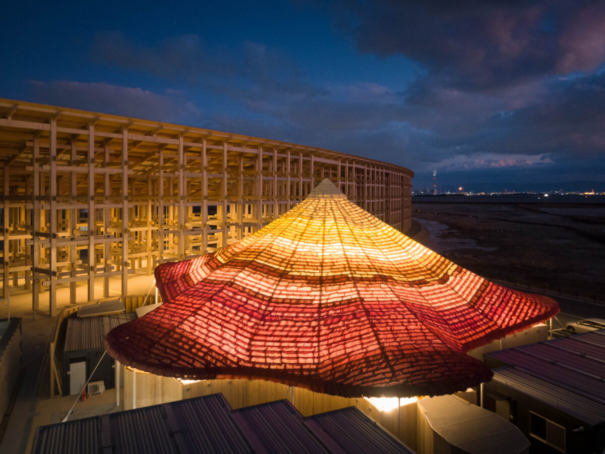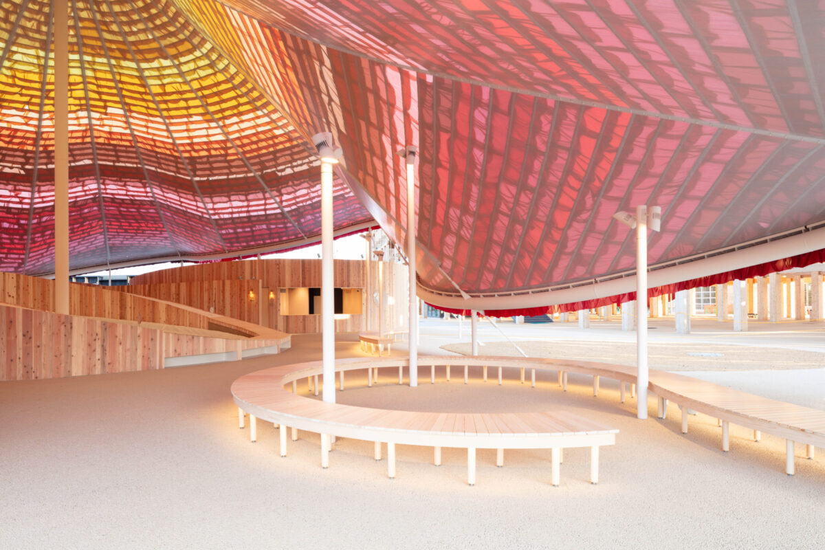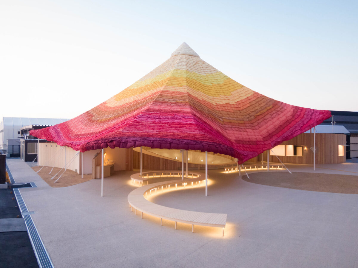 世界から多様な方々が来場される万博であることから「誰にも開かれた五感で感じることができる休憩所」とすることを考えて設計した、黄色、赤、オレンジのテキスタイルで葺かれた大屋根の休憩所である。