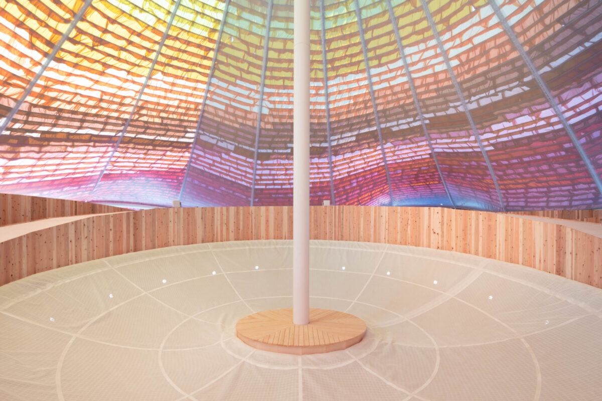 〈休憩所1〉では、テキスタイルにはファッション業界のデッドストック生地約40種が使われ、色も質感も異なる布を手作業で取り付けることで、美しいグラデーションの天蓋となっています。大屋根の下には、冷気が下からじんわりと伝わるハンモック状の床が広がり、体を横たえると風に揺れる布とやわらかな光が視界を包みます。