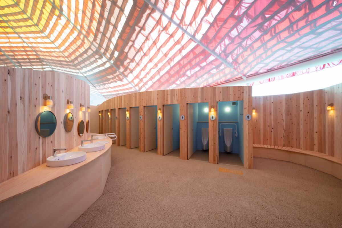 建築は通常、固く動かないものだと思われているが、風が吹くとさざなみのように揺れるテキスタイルをまとった特徴的な屋根の佇まいや、ひんやりとした触れたくなるネット状の床など、視覚はもちろん、触覚、聴覚、嗅覚など五感を触発する空間とすることで、誰もに開かれたインクルーシブな空間となることを目指した。