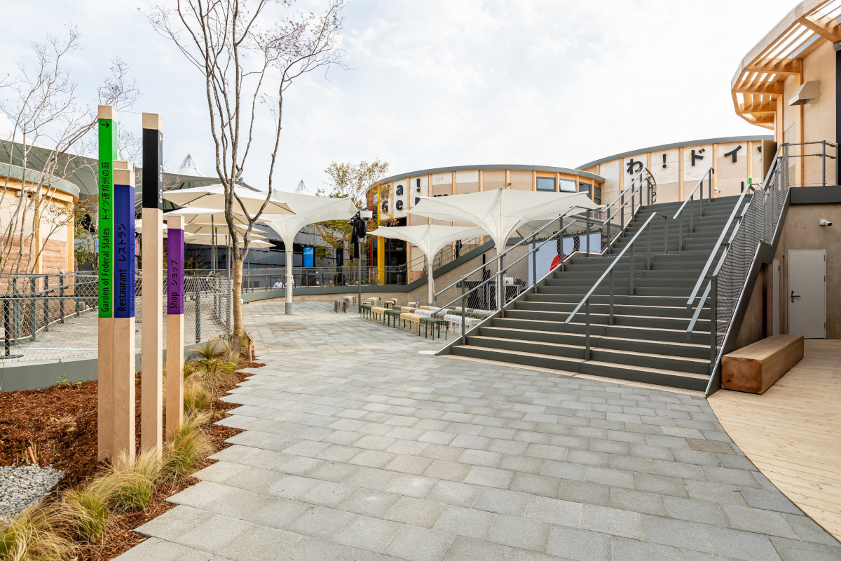 筒形ユニットがそれぞれに接合するかたちで配置され、展示エリアとレストランエリアという建物アンサンブルを構築しています。レストランに面しているグリーンガーデンは自由に行き来できます。展示の見学だけではなく、気ままな散策とくつろぎの空間を提供します。屋外エリアには〈ドイツパビリオン〉のイベントステージも併設されています。
