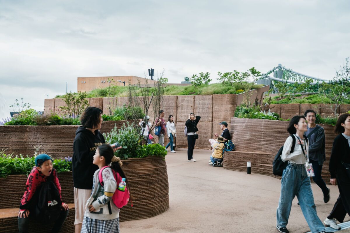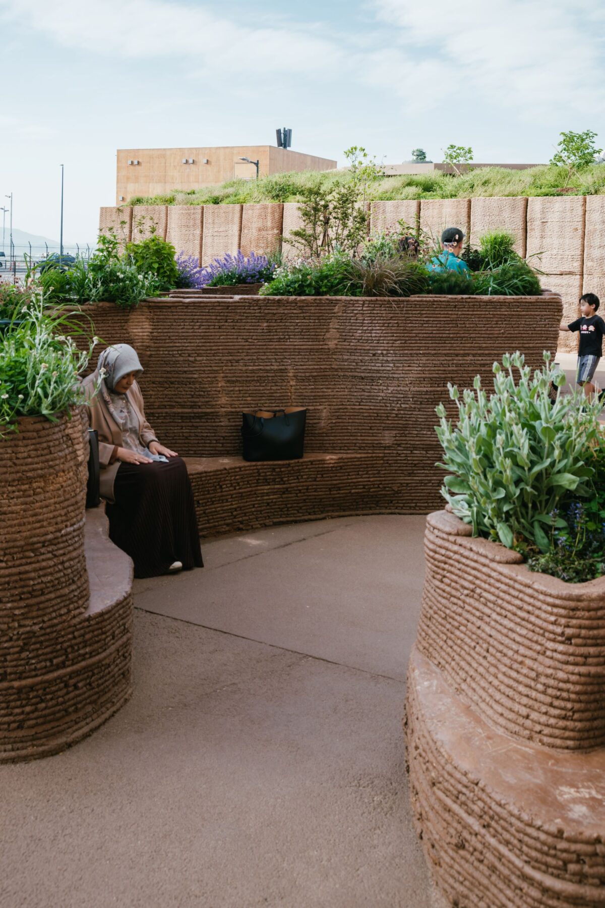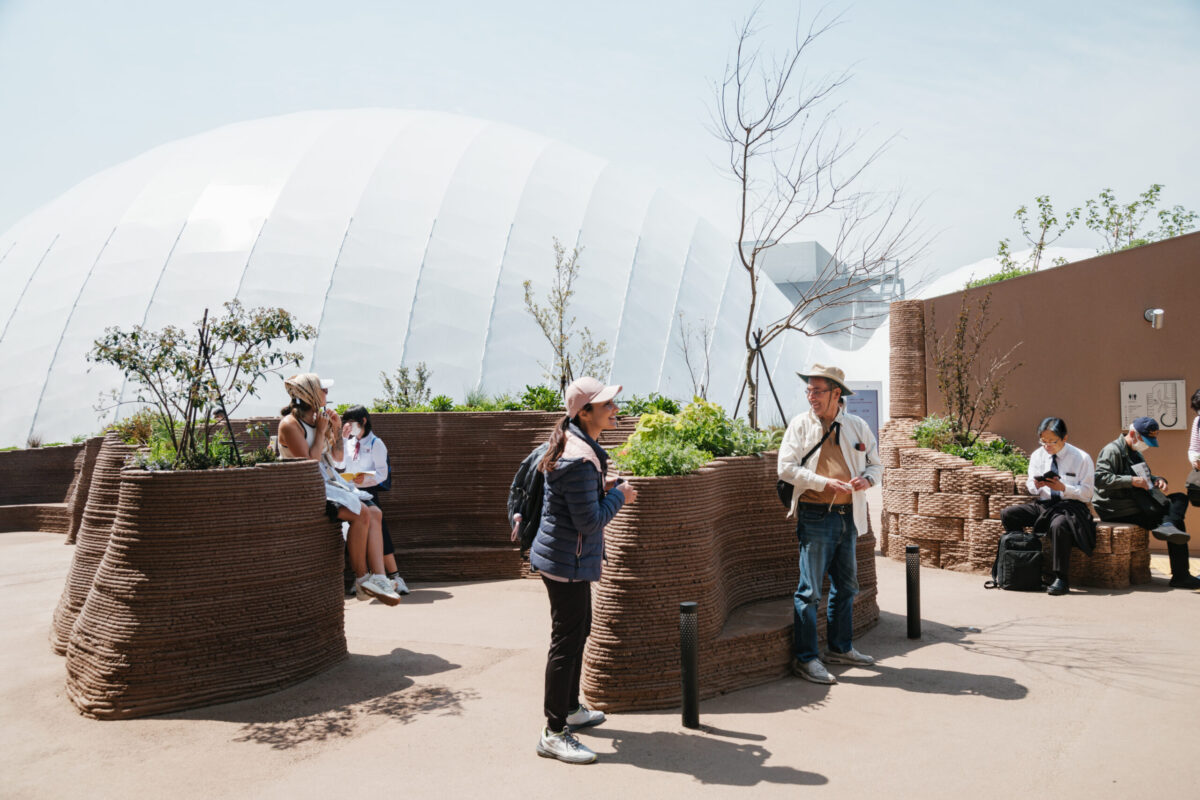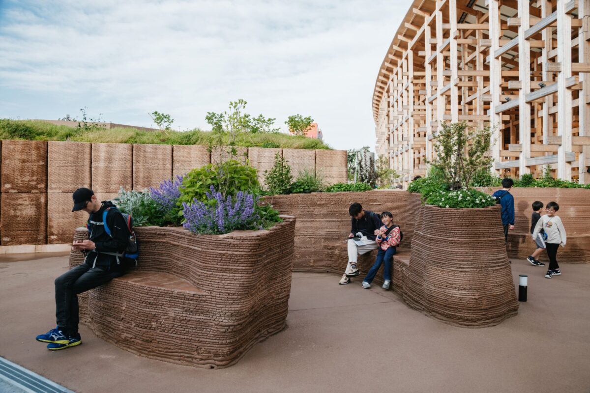 3Dプリンターを博覧会の敷地に設置し、ベンチやテーブルなどの機能を併せ持った、人と植物のためのプランターを出力した。直径6.2m、高さ1.7mのプリント範囲を目一杯に使ったプリントを敷地内の4箇所で行った。プランターの形状は来場者を取り囲むC型や複数の群島型など様々であり、様々な居方を許容する休憩の場となることを意図した。③土ブロック
