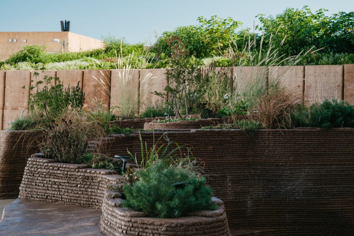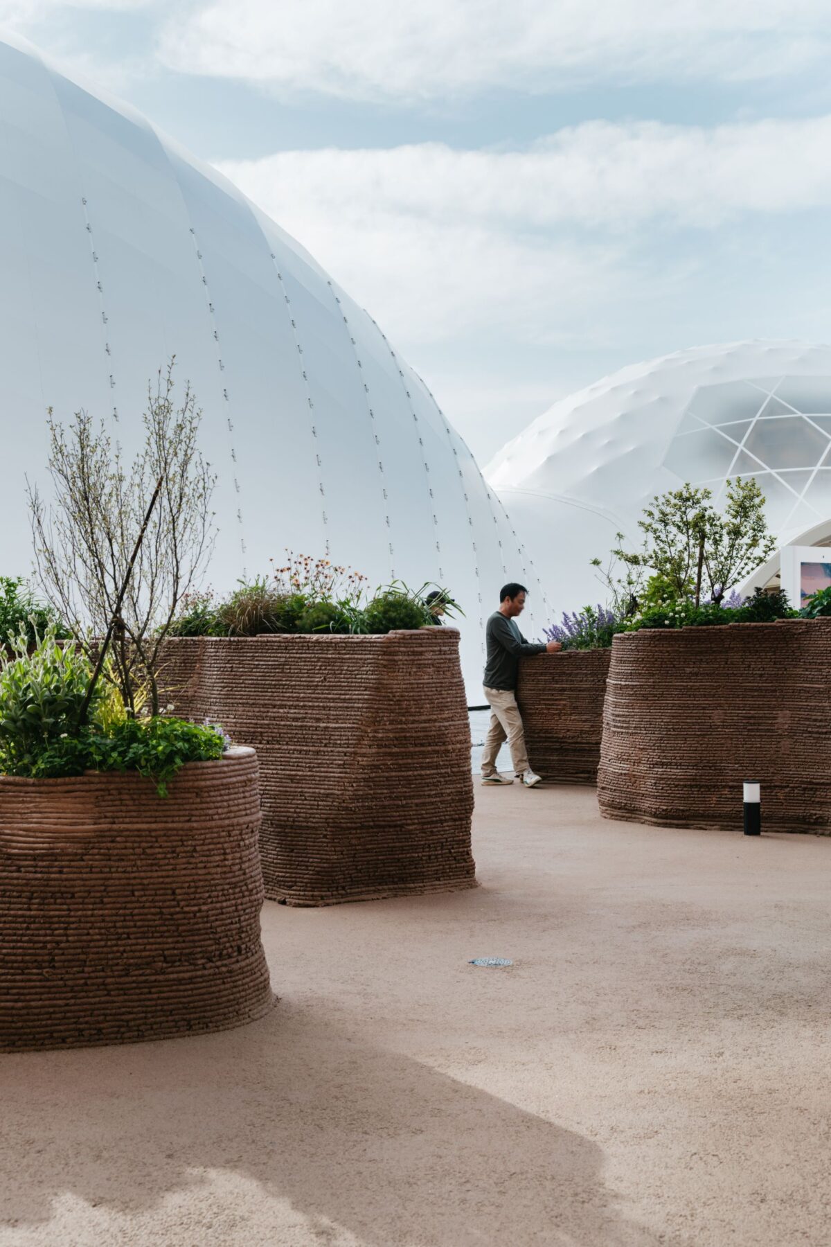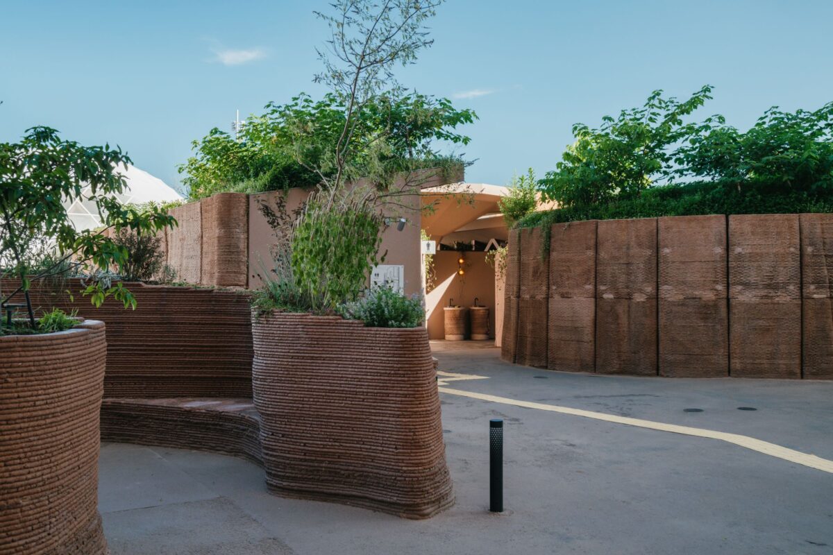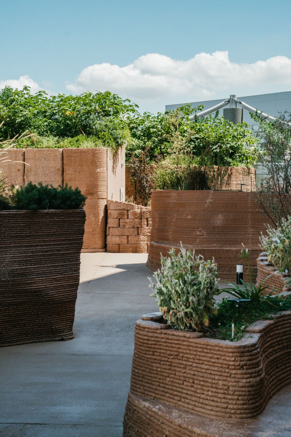 3Dプリンターを博覧会の敷地に設置し、ベンチやテーブルなどの機能を併せ持った、人と植物のためのプランターを出力した。直径6.2m、高さ1.7mのプリント範囲を目一杯に使ったプリントを敷地内の4箇所で行った。プランターの形状は来場者を取り囲むC型や複数の群島型など様々であり、様々な居方を許容する休憩の場となることを意図した。③土ブロック