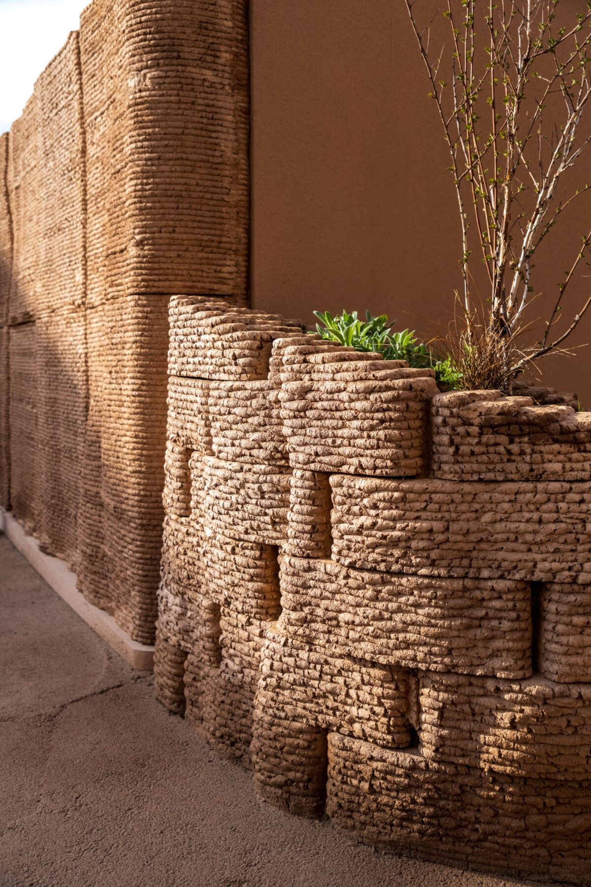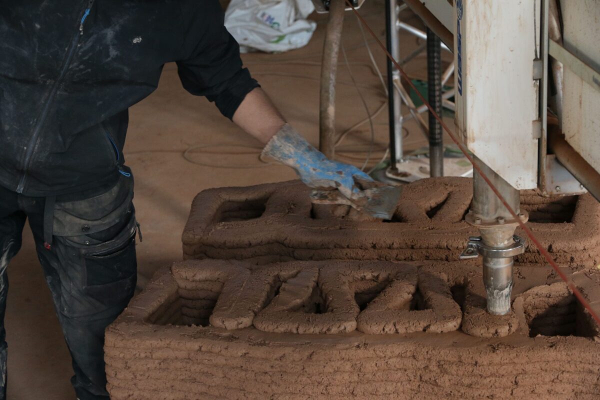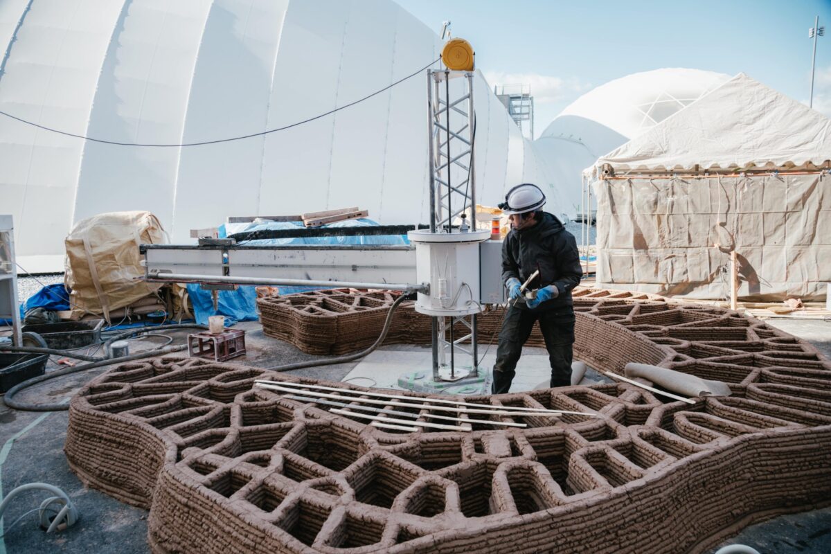 プリント素材には土、粘土、硬化剤、藁、顔料、海藻糊を用いており、日本の伝統構法である土壁から学び材料を選定している。それらは強度やプリントのしやすさだけでなく、全て日本国内で入手できることや、会期後の解体時に全て自然に還せることを条件に選ばれている。硬化剤に採用した酸化マグネシウムは、水と土とを混ぜることで硬化反応を起こす物質であり、プリント後に3日間湿潤養生した後に乾燥させることで高い強度を発揮する。