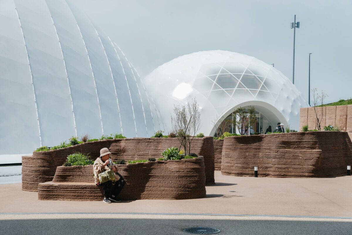 建築の外装を富山の工場で生産し、敷地に運搬して取り付けた。幅930mm、奥行300〜400mm、高さ1,200mmのプリントしたパネルを計56枚量産した。十分に乾燥した後は、トラックで博覧会の敷地に運び、クレーンで吊り上げ木造の外壁に取り付けた。パネルの表面の形状は全て異なり、一面に並べて繋げることで自然界の岩肌のような形状が浮かび上がる。躯体との取り付け部分には出力中に木材のピースをはめ込み、そこにスクリューを打ち込んで固定することで、土には一切傷がつかない方法を採用している。このサイズのパネルを3Dプリントし、輸送するために、プリント方法だけでなく移動方法や工事用クレーンでの吊り上げ方法、躯体への固定方法など、全ての施工手順を検討した。②ベンチプランター