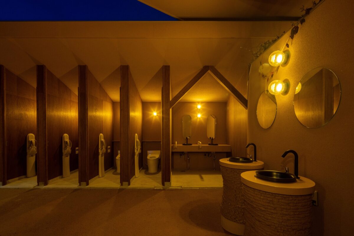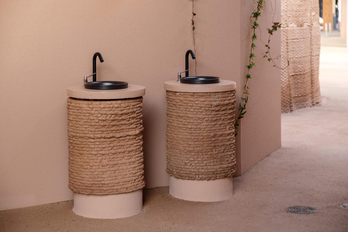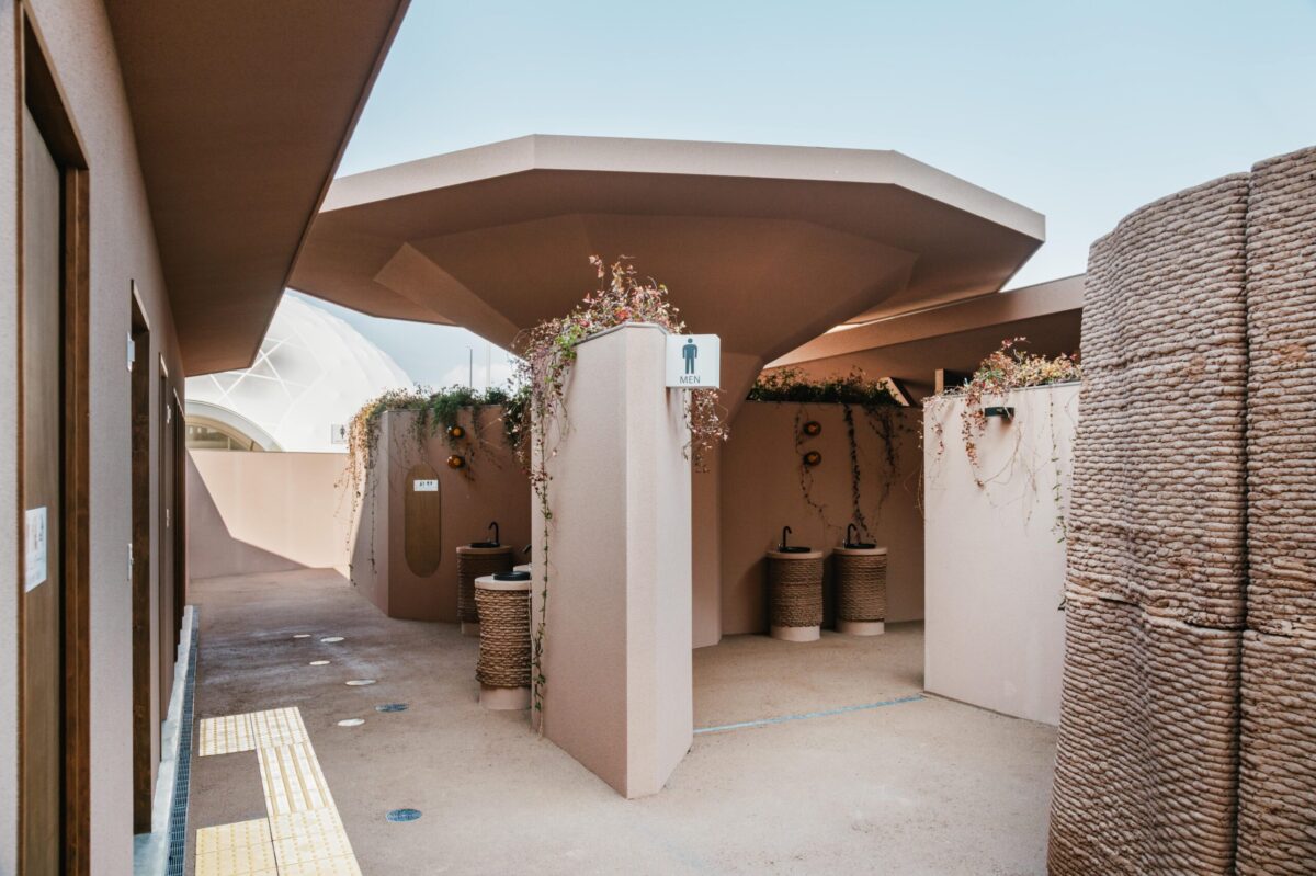 トイレを使用した人が使う手洗い台も工場でプリントし、博覧会の敷地まで運搬して取り付けた。正面の膝部分が窪んだ形状をし、背面にメンテナンス用の穴が空いた円筒の形状とした。