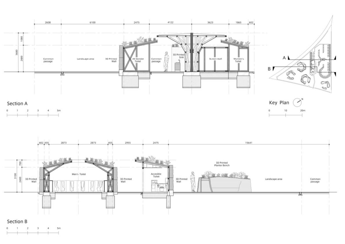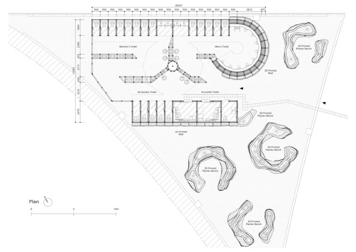 敷地でプリントするものだけでなく、小さなブロックで作るタイプのプランターも計画した。富山の工場で、形状のそれぞれ異なるブロックを45個プリントし、敷地で人の手で積み上げた。酸化マグネシウムを主成分とする硬化剤でブロック内部を充填し、鉄筋のかわりとして竹を差し込みながら積み上げることで一体性を高めて補強した。④手洗い台