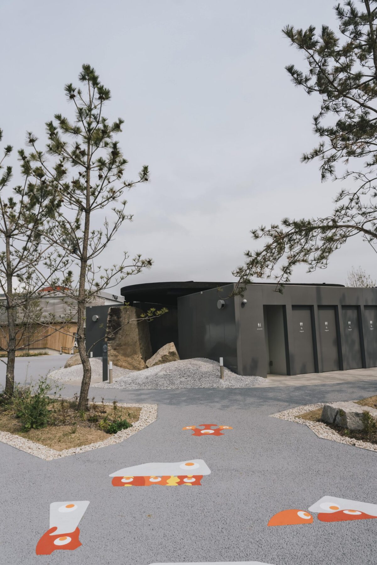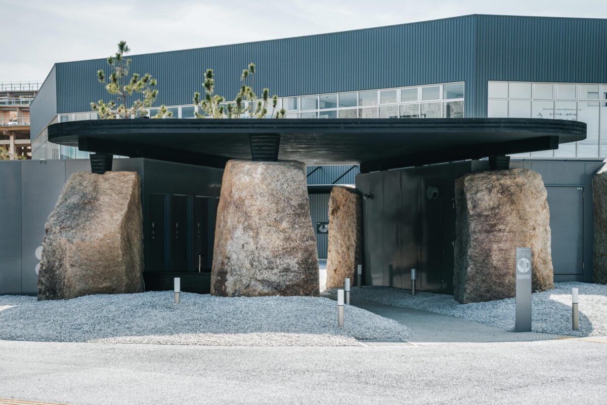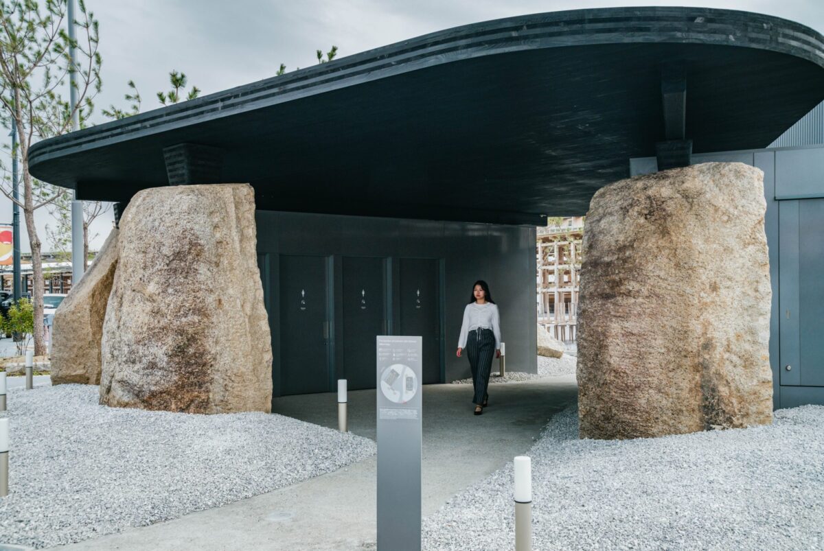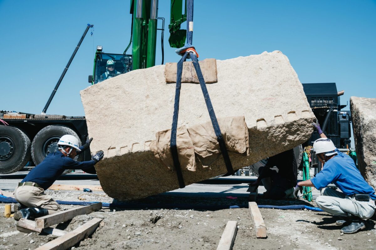 〈地球の形跡 / Traces of Earth(トイレ2)〉は、大坂城の石垣として切り出されたものの使われなかった「残念石」を大阪へ運び、建築として蘇らせる試みです。“石を運ぶ”という行為が、多くの人を巻き込み結果として建築をかたちづくる。設計のあり様を石に委ねながら、現代のテクノロジーと人の営みを重ねることによって、建築の本質を静かに問い直しています。