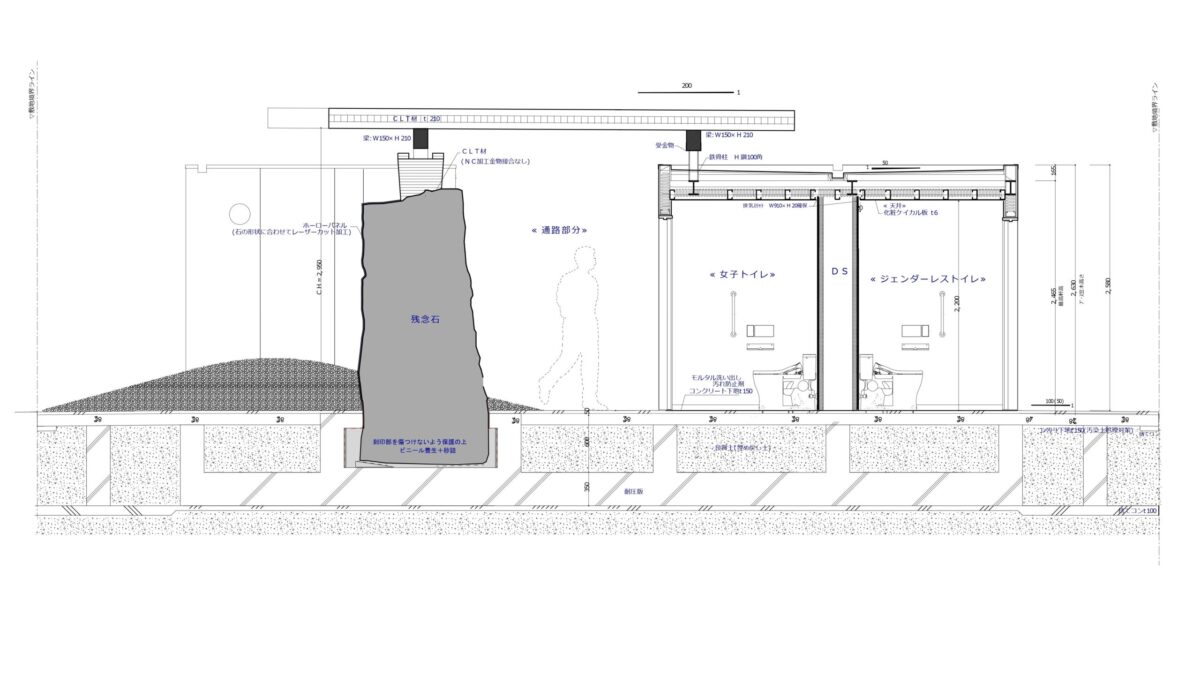 また、スキャンやNC加工などのデジタル技術を活用することで、石を傷つけることなく、建築が自然に合わせる形で立てた石の上に屋根が乗り、空間を生み出す。これは単なる効率化のためではなく、非合理なものや人間性を取り戻す手段としてデジタル技術を用いる試みでもある。この人の力を超えた自然と時間が息づく建築は、我々人間の根源的な感覚を呼び覚まし、建築の本質を問い直す場となるはずである。