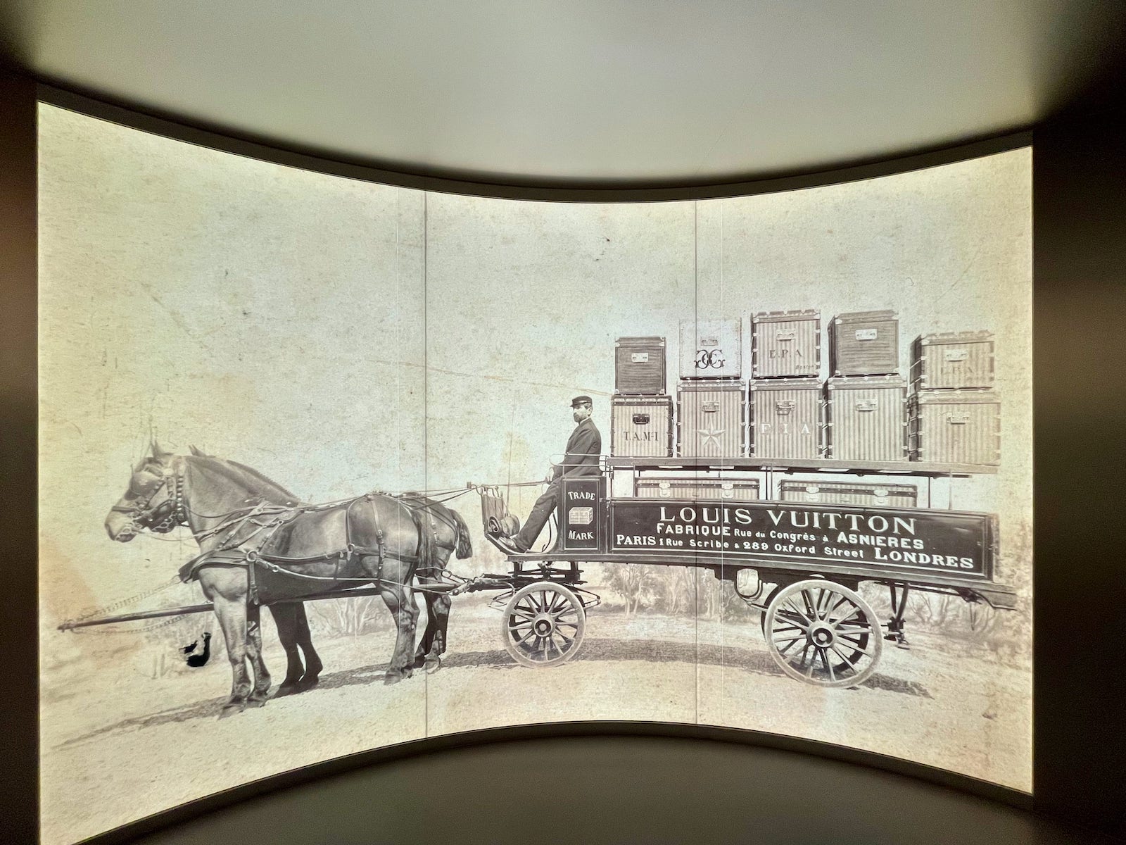 2つの部屋を繋ぐ空間では、馬車の荷台にトランクがうず高く積み重ねられた写真がスクリーンに大きく映し出されている。ここは、ルイ・ヴィトンの創業地であるパリ郊外のアニエールを想起させるとともに、ルイ・ヴィトンのイノベーションの歴史を感じさせるスペースだ。ルイ・ヴィトンは従来は丸蓋であったトランクについて、鉄道や船での移動が増えることを見越してフラットな蓋を考案。また素材を見直して軽量化に成功するほか、模造品を防ぐためにモノグラムを考え出し、ブランドのアイコンとなった。