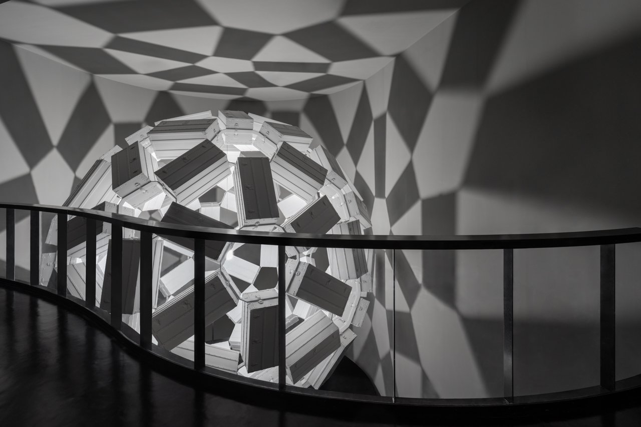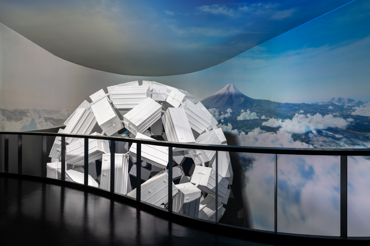 そして2つ目の空間に至ると、1つ目とは一転して暗い闇に包まれる。奥の2層分の吹き抜けに浮かび上がるのは、大きな球体(スフィア)。近づいて見ると、この球体もまたトランクでできている。重松氏は「これも、トランクのモジュールで空間をつくることができないかという試みです。トランク自体が構造になり、軽くて丈夫なことが瞬時に伝わります。球体は世界的なイメージがあるため、これまで万博で多くつくられてきたモチーフです。今回は真鍋大度さんとのコラボレーションで照明とプロジェクションマッピングを行い、未来を強く予感させるものとなっています」と語る。