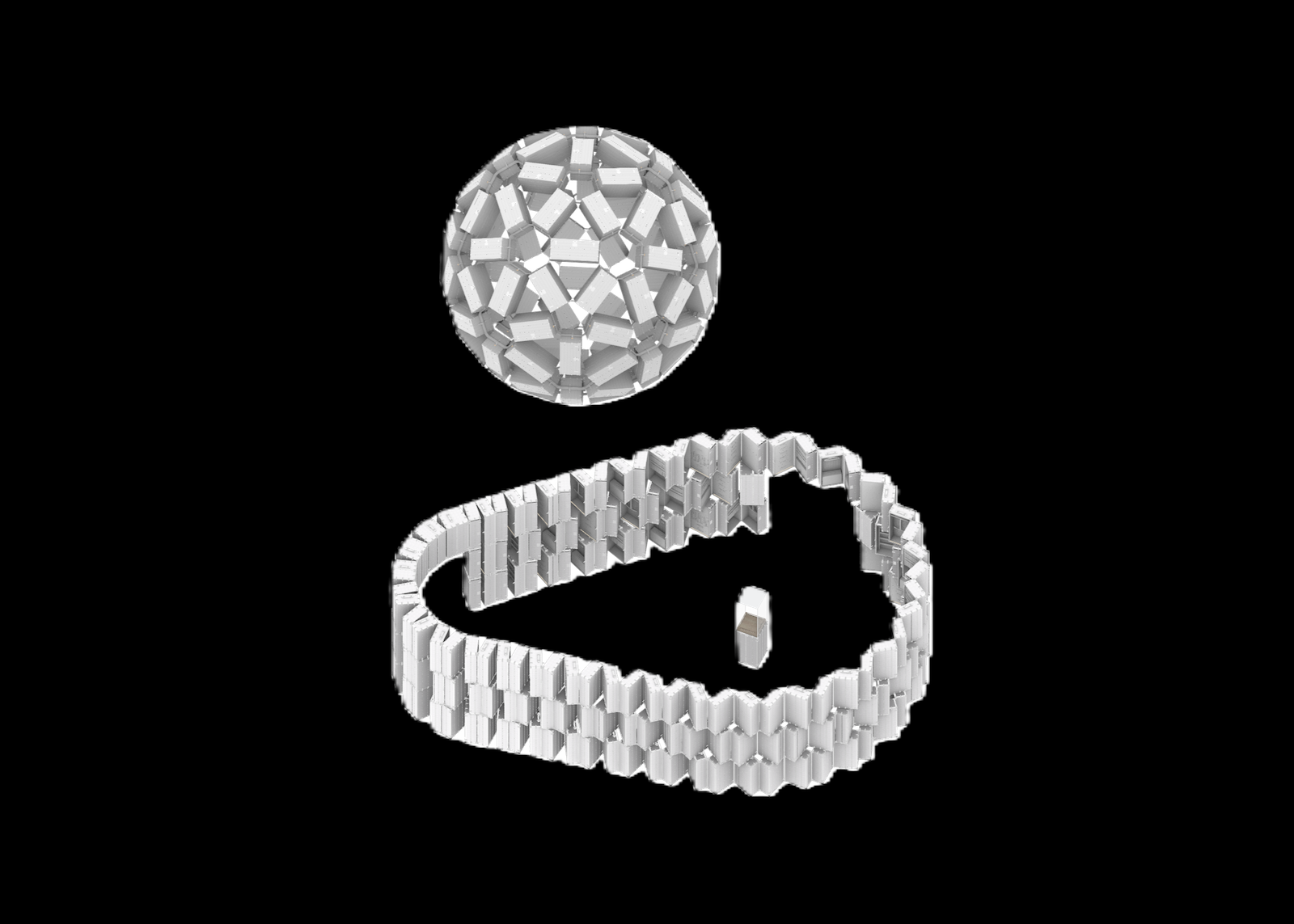 1つは、伝統的な手づくりの技を感じさせる空間。フランスの彫刻家オーギュスト・ロダンによる手の彫刻『カテドラル』を中央に据え、作品を取り囲むように、壁面には床から天井までいっぱいに84個のワードローブ・トランクが配されている。トランクはすべて開いた状態で、トランクの中をルイ・ヴィトンが使い手に合わせてカスタマイズしてきたことを抽象化。トランク内では職人たちが制作する様子を映像で伝え、内側に仕込んだ照明からは、ランタンのように柔らかい光を拡散する。