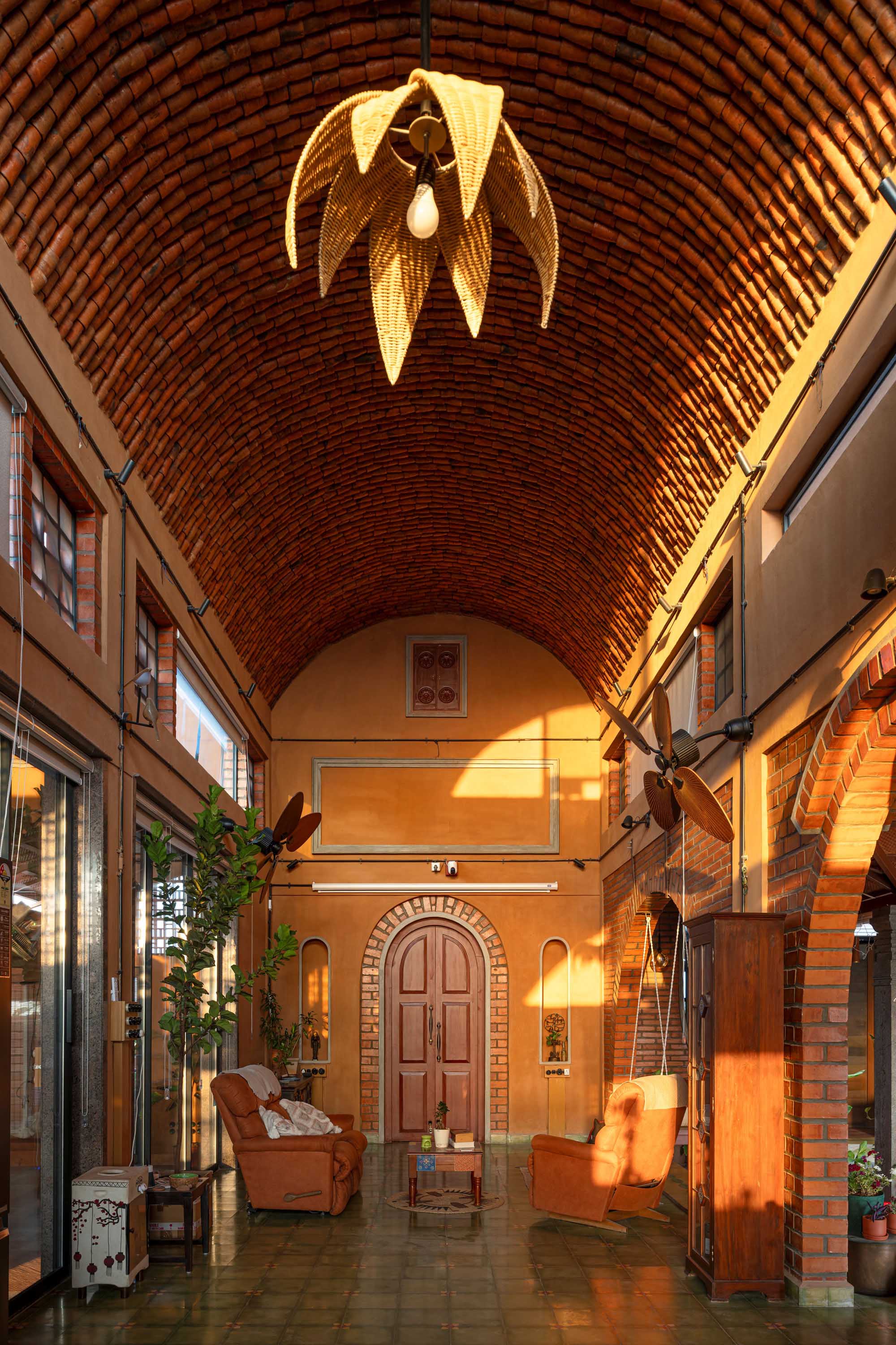 屋根の造形は「空隙」の科学を活用している。互いに噛み合うテラコッタ製のグナ管が断熱空気を閉じ込め、レンガのジャックアーチが再利用された構造用鋼材の間に圧縮されている。