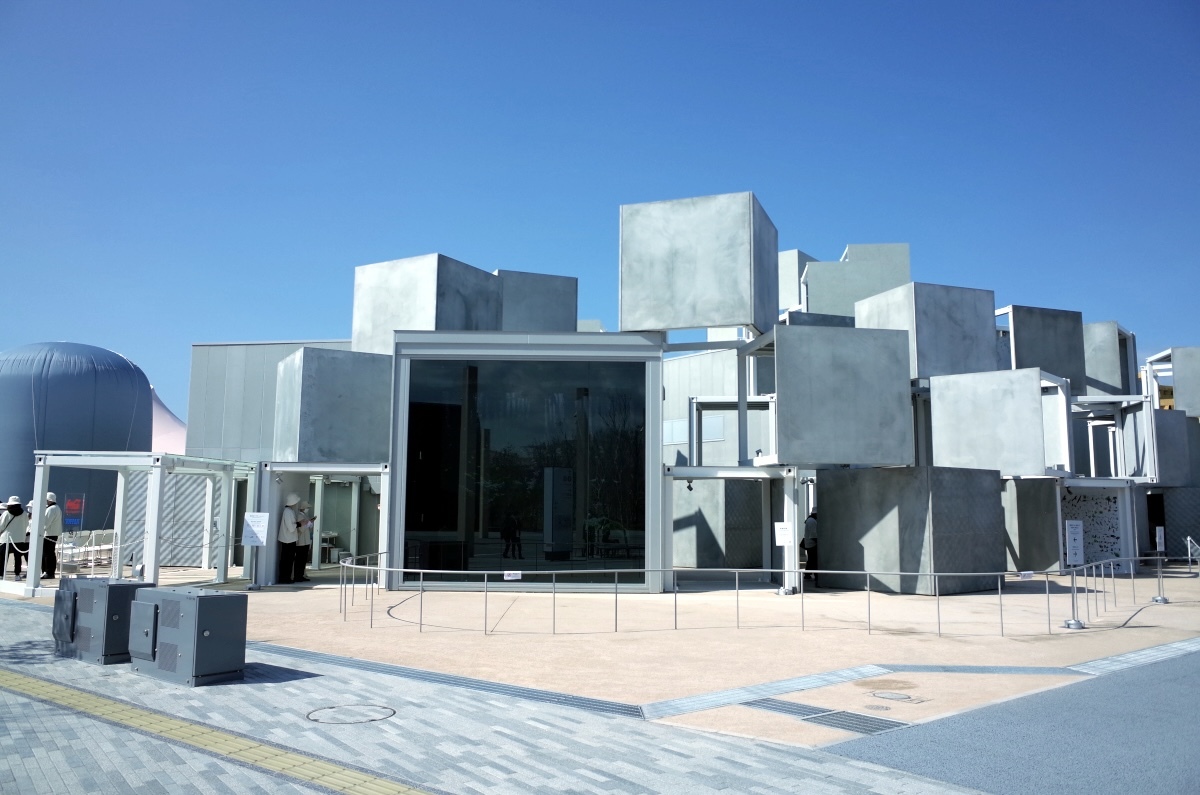 〈いのちめぐる冒険〉は、鉄骨フレームに海水練りコンクリートパネルを組み合わせて構成されました。真水を使用せず海水を活用したコンクリートは、資源制約への応答として明確な素材選択となっています。立方体ユニットを反復する構法により、部材の規格化と施工性の向上を図りました。会期終了後の解体を前提に、素材調達から撤去までを含めた循環性を建築条件として組み込んでいます。