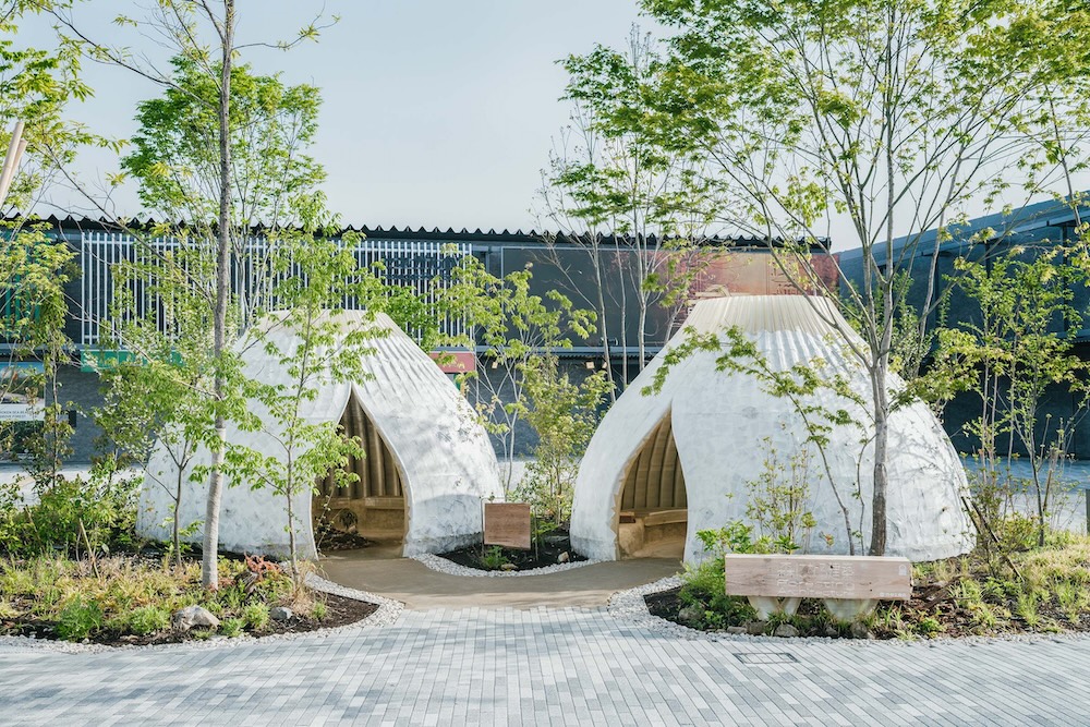 〈森になる建築〉は、生分解性樹脂を3Dプリントして構造体を形成した仮設建築です。植物由来の酢酸セルロース樹脂を主要構造材に用い、外装には種入りの紙を貼り付けて植物の成長を促しました。建築そのものが時間をかけて分解し土に還ることを前提に設計されており、素材選択から撤去までを含めたサステナビリティのあり方を示しています。紙や種子はワークショップで参加者と共同制作され、素材循環のプロセスを建築に反映しています。