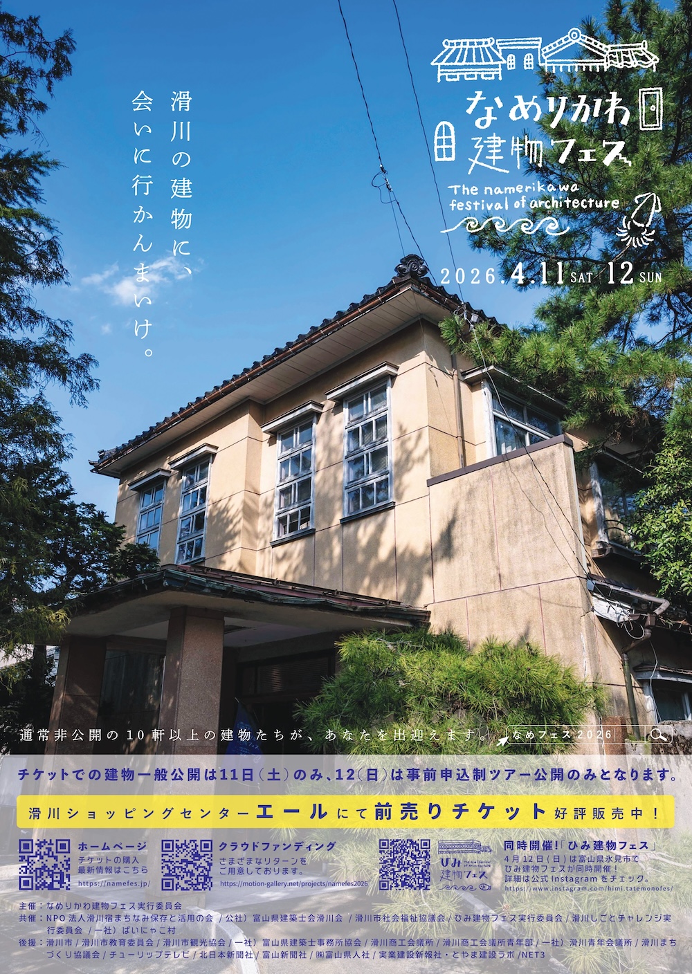 富山県滑川市で開催される「なめりかわ建物フェス」は、市内に点在する歴史的建築や文化財を特別公開する建築イベントです。普段は立ち入ることのできない建物を公開し、まちを歩きながら“建物が語る物語”を体感できる2日間として実施されます。公開に加えて、ガイドツアーやトークイベント、地域産業に触れる企画なども用意されており、建物を「見る」だけでなく、その背景や地域との関係を知る機会が提供されます。地域に残る建築の価値を再発見し、次世代へとつなぐことを目的とした取り組みです。