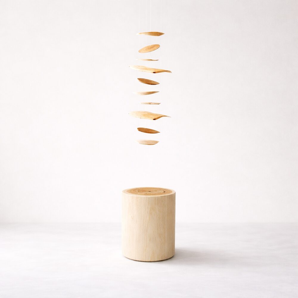 本展で発表される「yusan stoolーForest, in time.」は、丸太をあえて「輪切り方向」にスライスすることで、年輪をそのまま意匠として取り出した突板を用いたスツールです。本作の技術的特徴は、合板(ベニヤ板)の製造に用いられる旋盤加工を応用し、通常とは異なる「輪切り方向」のスライスを実現した点にあります。本来、乾燥による割れが生じやすい断面を素材として成立させるため、特殊な後処理工程を経て安定化。座面に現れる約50年の歳月が、鑑賞者に同時代・同地域に生きた生命への想像を促します。