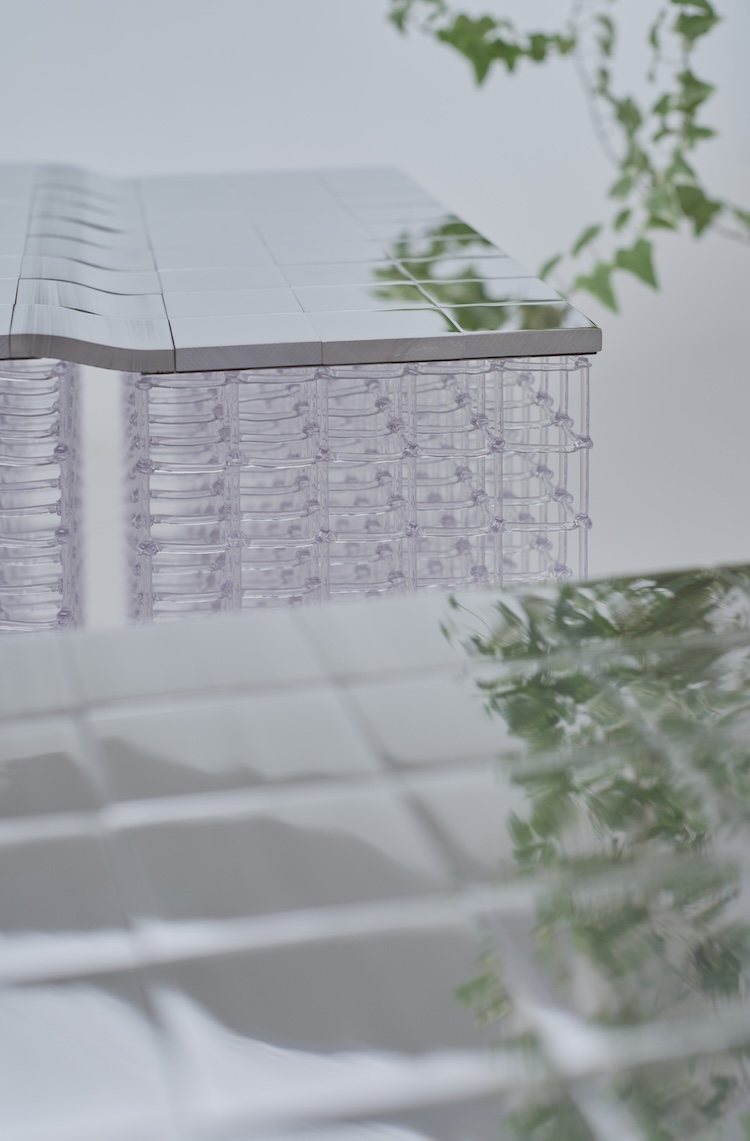 展示会場は、ミラノの歴史的な情緒が漂うエリアに位置し、1階のメインフロアでは、素材・構造・空間が一体となったプロトタイプ3種(天板が弧を描くように曲がる「カーブ」、足元のペダル操作によってタイルごとにせり上がる「リフト」、表面全体が自動で波のように起伏し続ける「フルタイル」)が展示され、来場者は、光の粒子が溶け合うような風景の中を歩き、見る角度や距離によって刻々と変化する作品の表情を体感することができます。デジタルファブリケーションとクラフトマンシップの融合により立ち上がる、金属の流動的な佇まいは、素材が持つ情緒的な命を空間に吹き込みます。