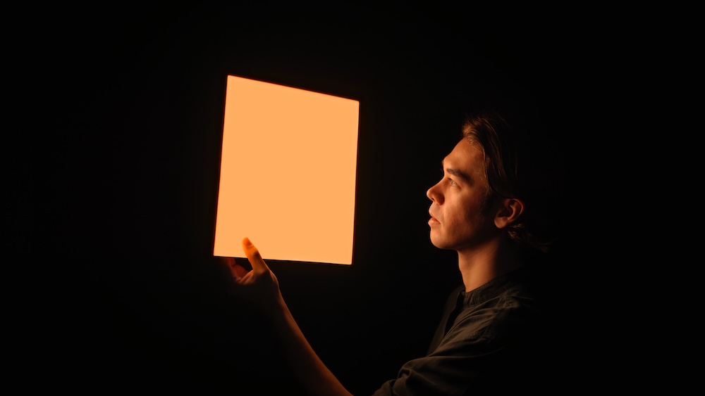 MEDUMの取り組みの特徴は、既存の『無機EL』という技術に対し、デザインによる新たな解釈を加え、情緒的なプロダクトへと再定義した点にあります。低電力で発光するこの素材を、単なる文字表示のデバイスとしてではなく、空間に情緒をもたらすテクスチャとして活用。暗がりの展示空間において、重なり合ったシートの隙間から漏れる微かな光や、壁面に落ちる柔らかな影のディテールを、視覚と直感の両面で体験できる構成となっています。