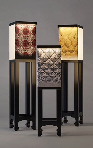「行燈(The An-Don)」:和紙を通した柔らかい光で火を保護し、陰影を演出した日本独自の照明文化を、現代のフロアライトへと再定義。美術織物の鑑賞を光とともに体感する装置として設計されました。