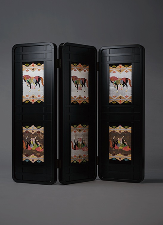 「屏風(The Byou-Bu)」:空間を自由に分割する機能性と「可動式のアート」としての側面を統合。龍村の帯地を移動可能なアートとして存在させています。