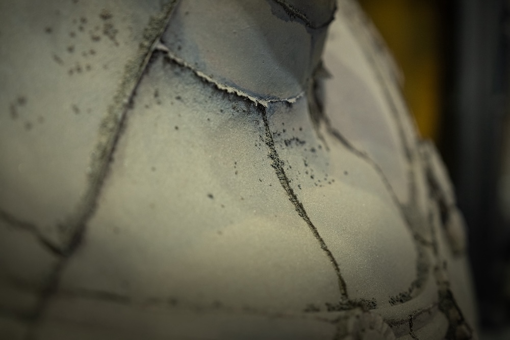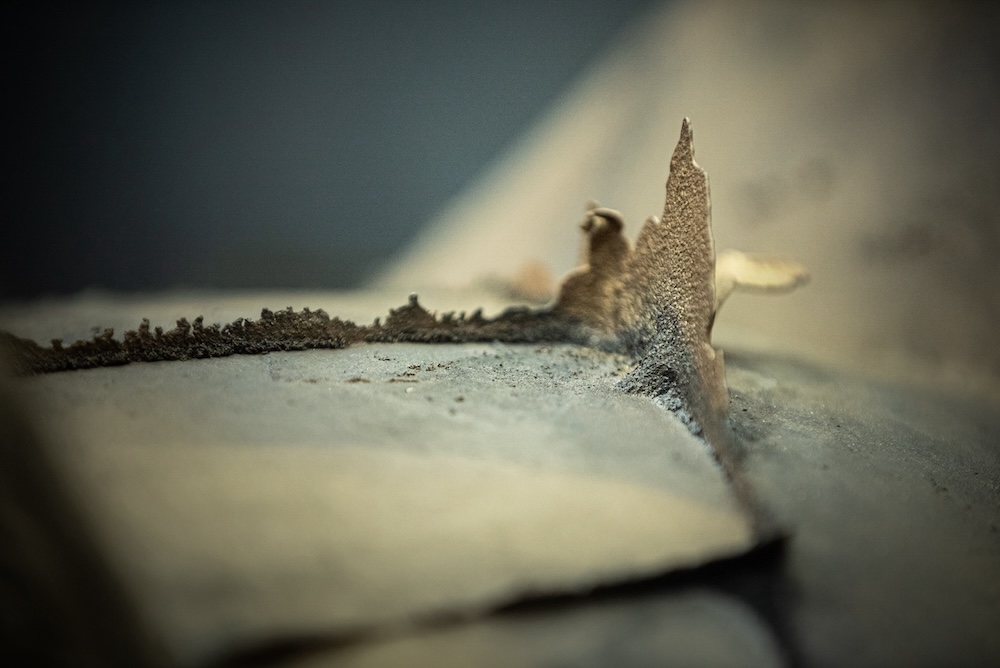 今回のコレクションで主役となるのは、砂型を用いた鋳造において、型の継ぎ目から溶けた金属が溢れ出し、そのまま固まって生じる余剰部分、すなわち「バリ」です。通常は製品としての完成度を高めるために除去されるこの物質の痕跡を、we+は金属が凝固する過程で立ち現れる「物質の生命力」の転写として捉え直しました。生成されたバリのパネルを丁寧に積層し、板材を挟み込むことで構成されたシェルフやローテーブルは、人の手による制御と、素材が持つ抗いがたい偶然性が共存する、彫刻的な佇まいを見せています。