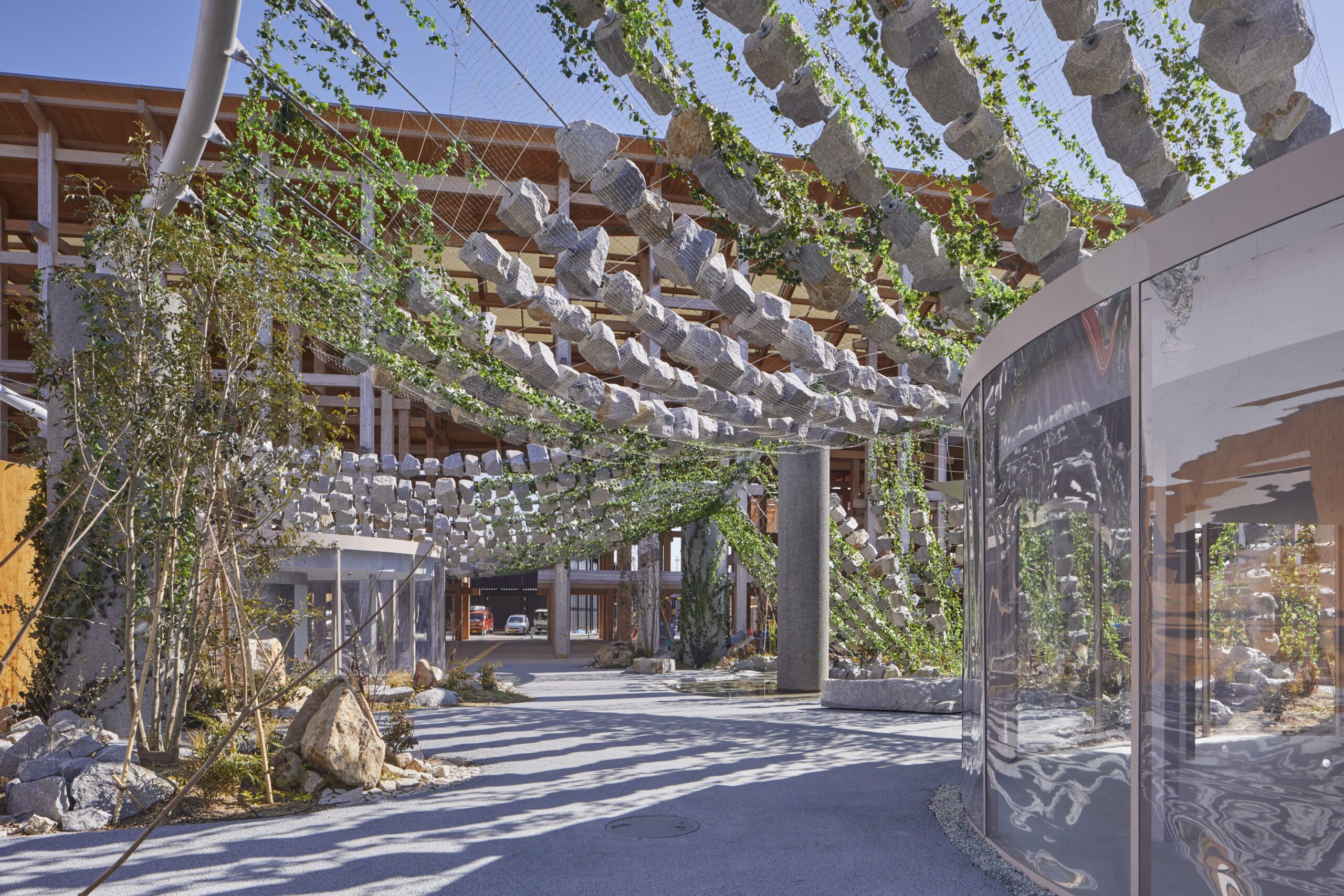 建屋は分棟形式で分散配置され、それぞれの棟を、瀬戸内産の自然石を吊るしたパーゴラがゆるやかに繋いでいます。自然石は会期終了後、大阪湾へ沈められ、海洋環境の一部として新たな役割を担う予定で、仮設でありながら壮大な時間軸を内包する建築です。