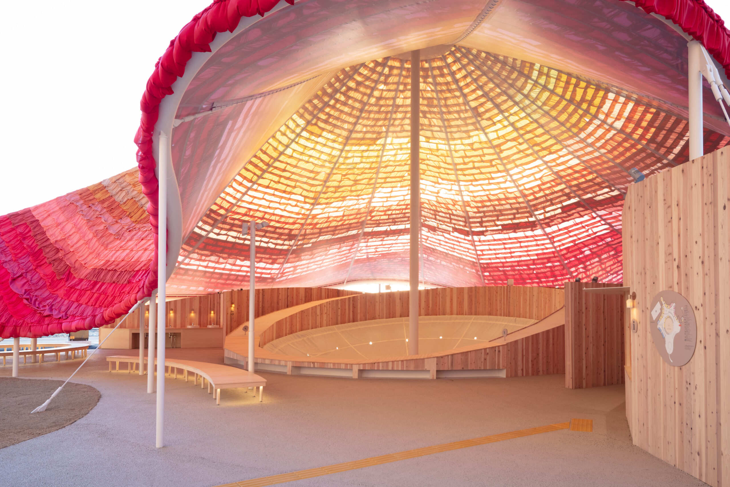 会場デザインプロデューサーを務める藤本壮介氏の企画により、40歳以下の建築家を対象にした公募型プロポーザルで選ばれた20組が設計を担当し、トイレや休憩所、展示施設など、日常的な用途を担いながらも、それぞれの建築家が自由な発想で空間を提案しました。