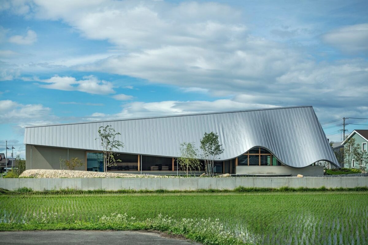 田園風景の中に建つ企業の新社屋。環境に溶け込むのではなく、建築の存在によってその魅力に気づかせる「装置」としてのあり方が構想されました。東へ大きく立ち上がり、低く地に迫る屋根は、光や風、天候の変化を際立たせると同時に、内部へと自然を導く役割を担います。共用部や執務空間には内外を繋ぐ中間領域を織り込み、風景と働く場が緩やかに交差します。