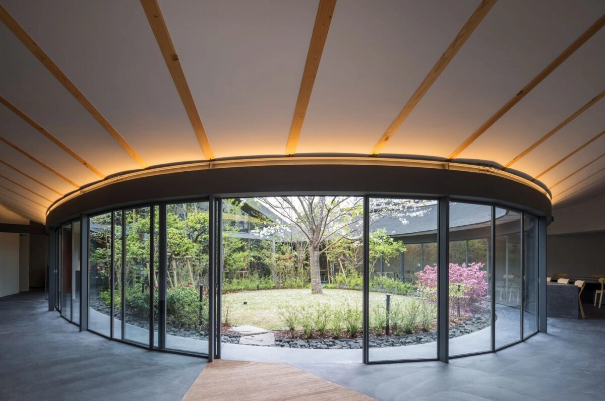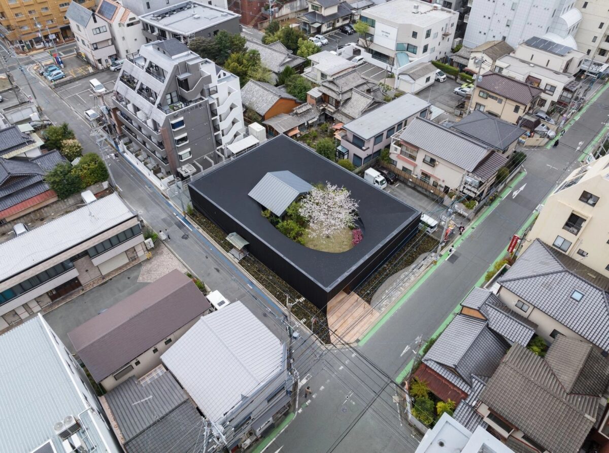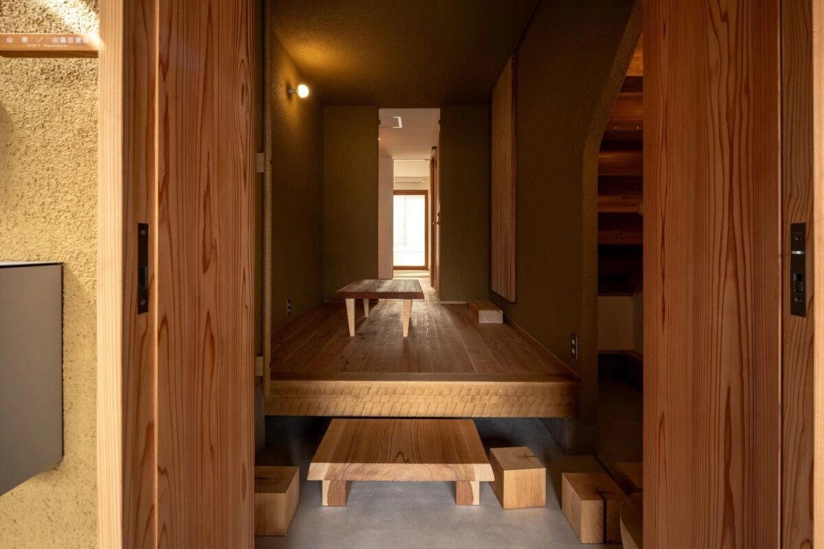 都市部の雑多な環境から切り離された体験を生み出すため、黒い矩形の外殻の内部に楕円形の中庭を据えた飲食店です。異なる趣向をもつ2店舗が中庭を介して並びます。楕円の中庭は回遊する動線の中で角を感じさせず、静かな中心として機能します。旧家に残されていた建具や石、庭木などを選択的に転用し、土地や地域に蓄積された記憶を新たな建築へと編み込みます。