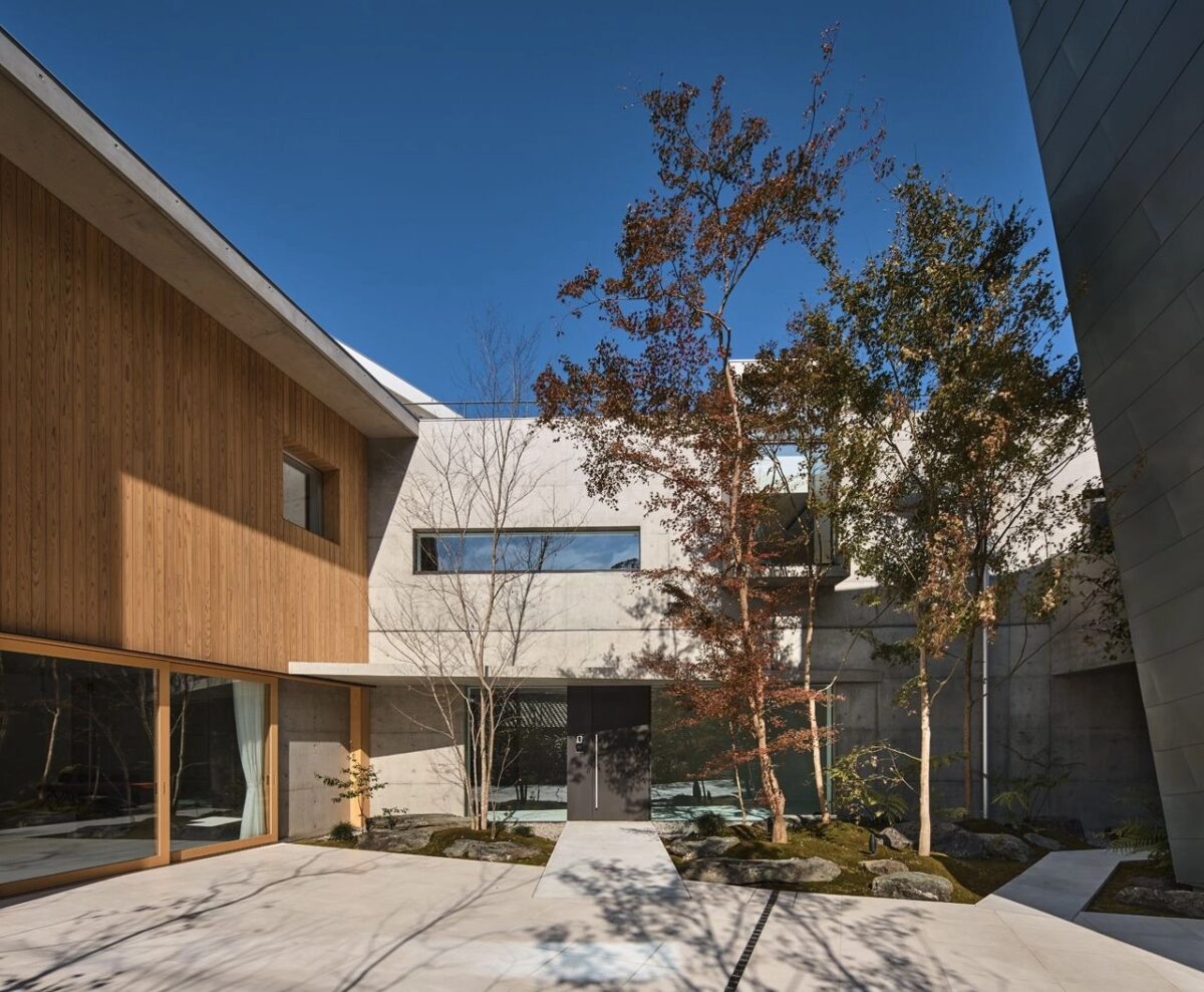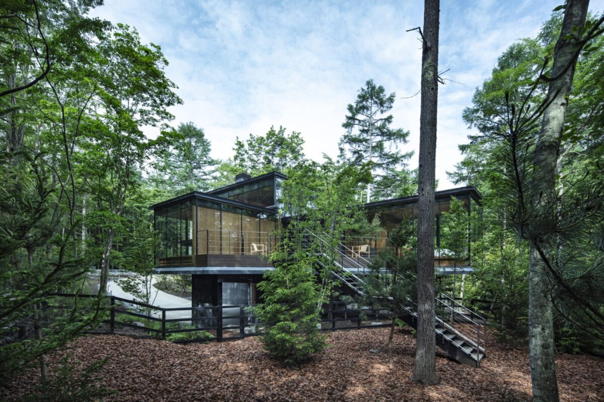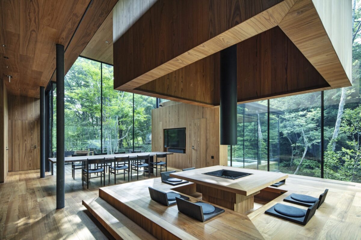 北軽井沢の森に建つ、囲炉裏を中心に据えたヴィラ型の別荘です。中央の囲炉裏を核に、ガラスと木による内と外が緩やかに繋がります。炎の揺らぎや森の光、風景の変化を五感で受け止めながら、人が自然と集い、語らう場となることが意図されました。2棟のうち一方はペットと過ごせる仕様とし、滞在のあり方に応じた更新も重ねながら、日常と非日常のあわいに身を置く体験を提供します。