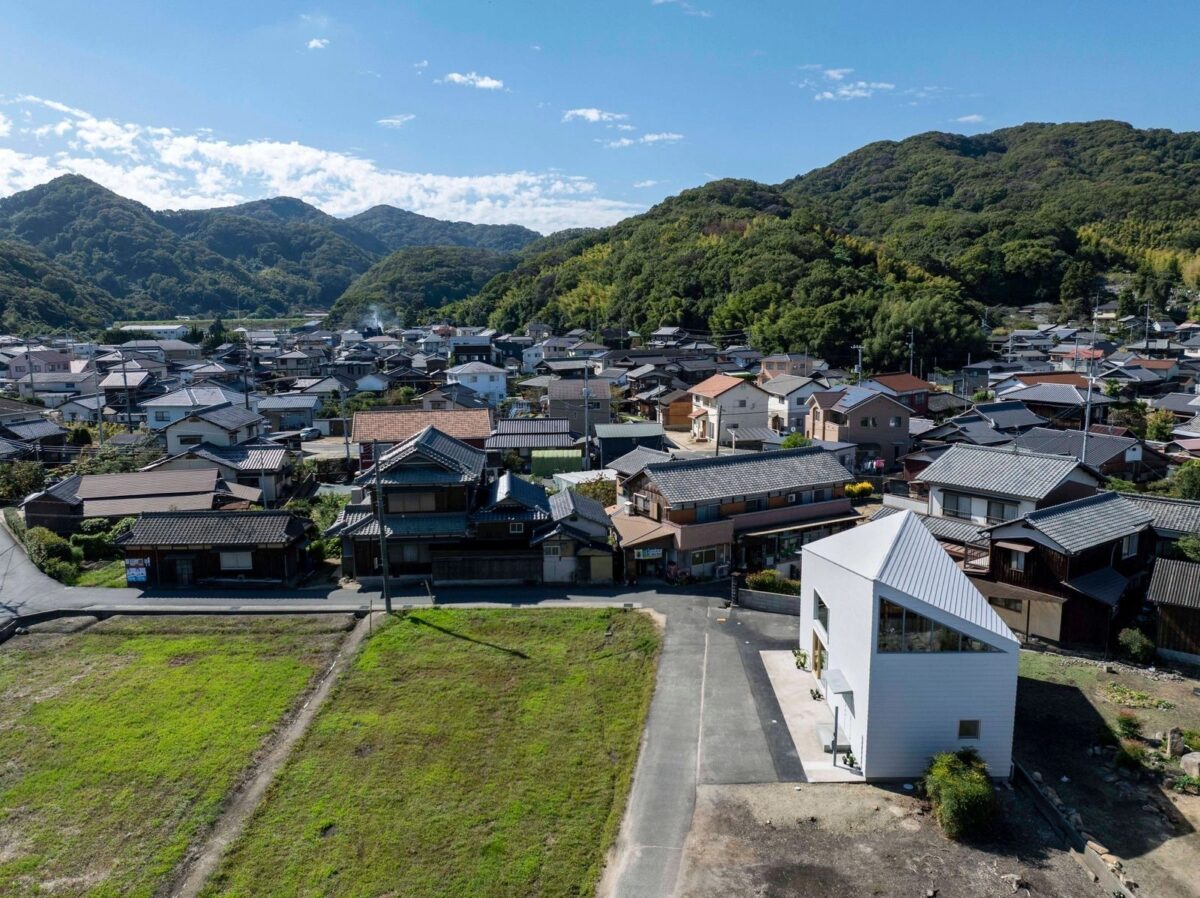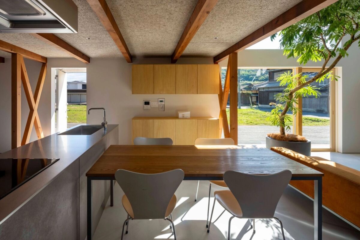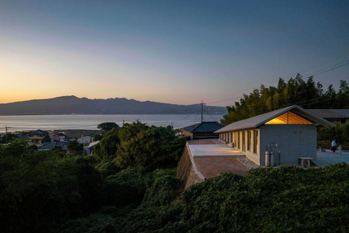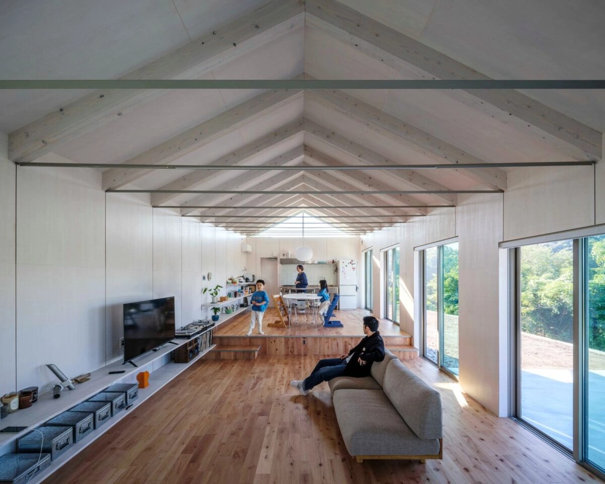 かつて果樹の段々畑だった斜面地の履歴を引き受けて計画された木造平屋住宅です。平坦化された敷地に対し、建物の断面を本来の斜面の傾きに沿わせることで、山から海へと土に沈み込むような構成を与えています。構造や寸法には一定のリズムを与え、斜面の変化を身体的に感じ取れる空間を形成するとともに、地盤条件を踏まえた合理的な基礎計画が、土地に即した住まいを実現しています。