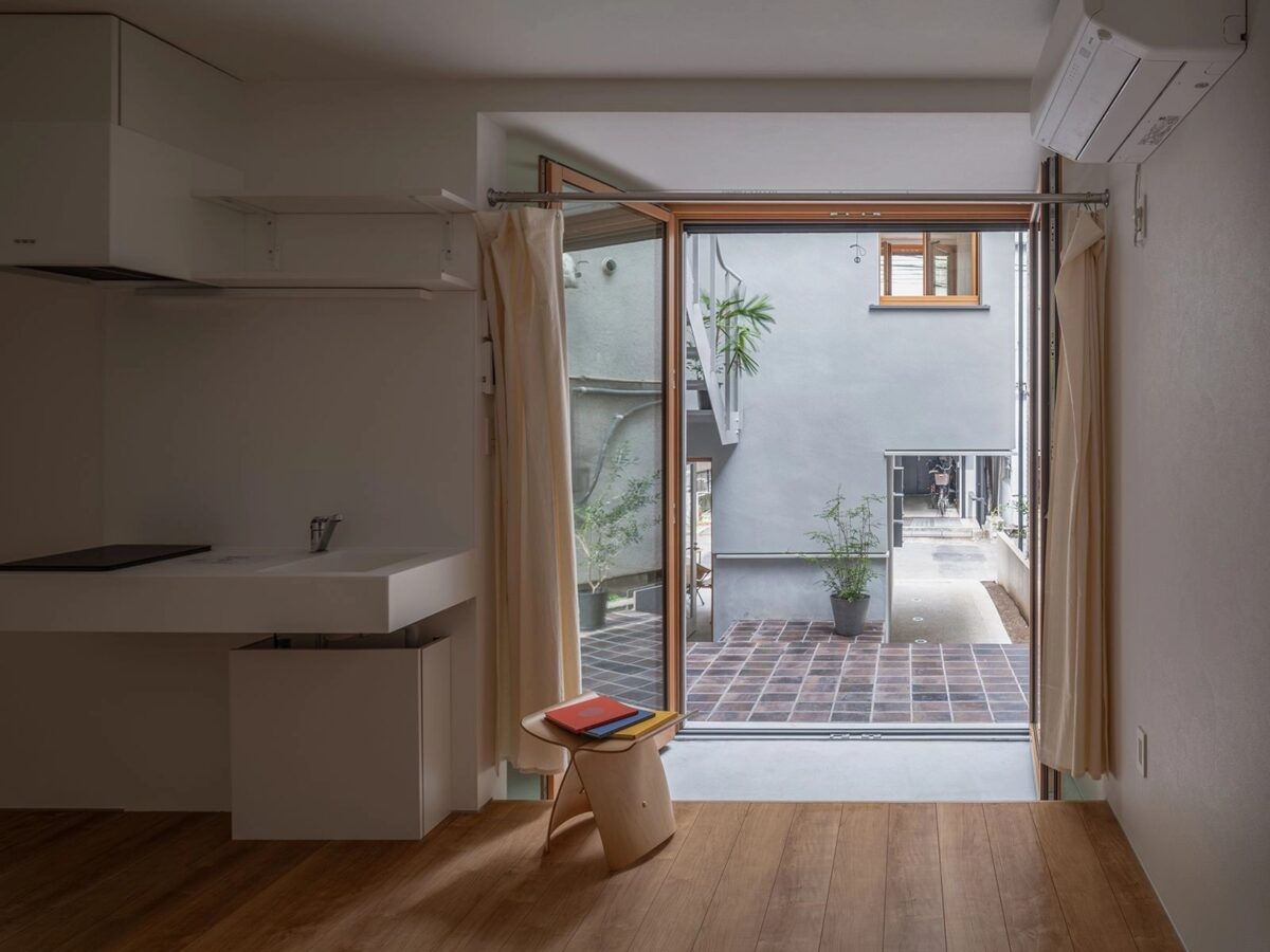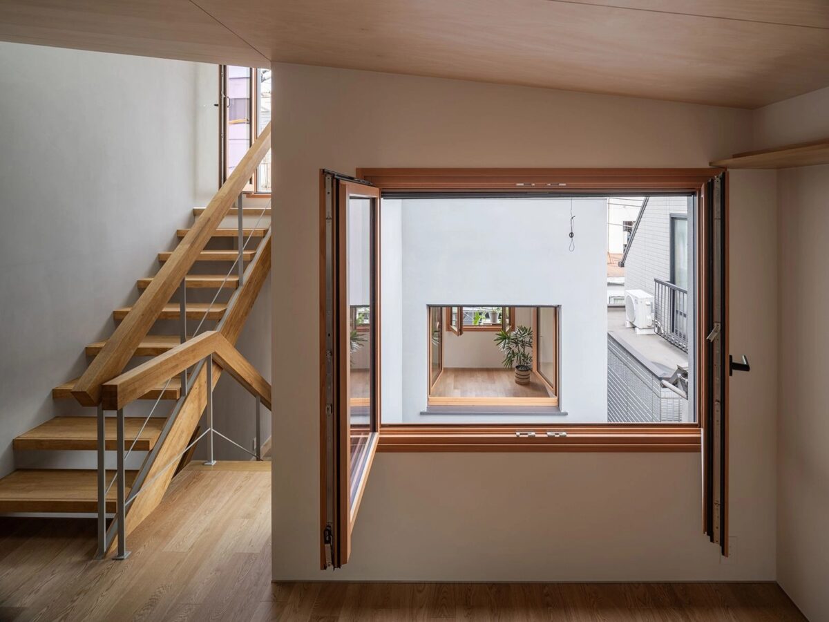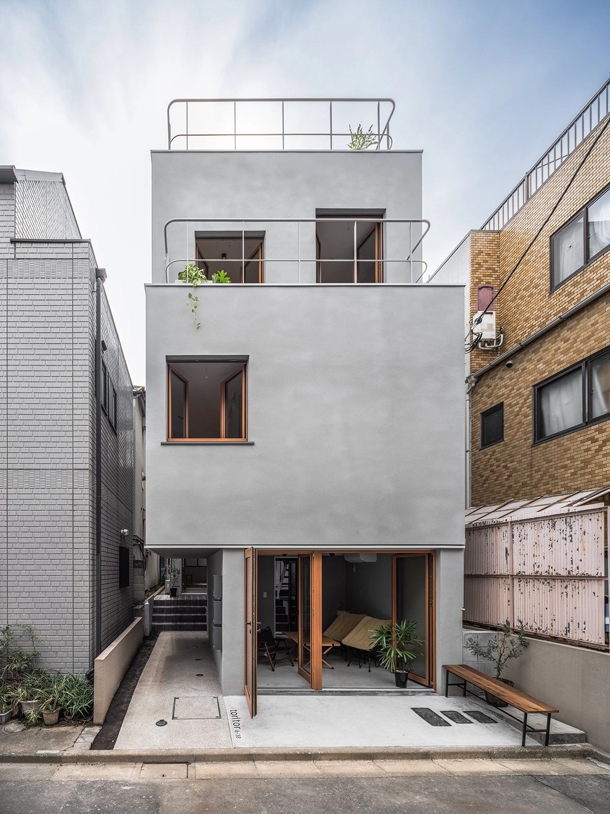 オーナー住戸と2戸の賃貸住戸からなる木造3階建ての賃貸併用住宅です。細長い敷地に生じる約1mの高低差を生かし、スキップフロアを連続させることで立体的な住空間を実現。中央に設けた中庭と階段室が、光や風を導きながら上下階の視線と動線を緩やかに繋ぎます。通りに面したシェアスペースを地域に開くことで、住宅に公共性を組み込み、まちとの関係を更新する試みとしています。