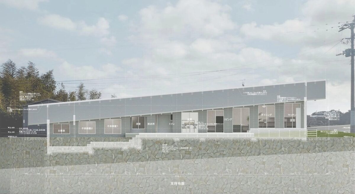 佐々木翔 氏(以下、佐々木):敷地は、私たちが設計活動の拠点としている島原半島の一角、長崎県雲仙市にあります。海沿いの国道と山側の農道が並行して走っており、それらをつなぐ道路沿いに建つ細長い平屋の住宅です。