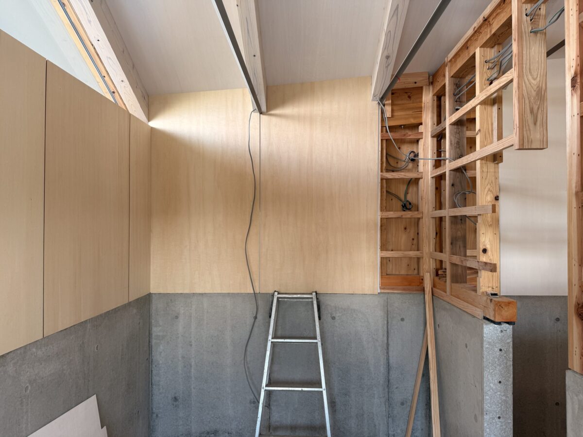 半地下の構成になるため、基礎の段階では防水と断熱をどのように成立させるかが大きなポイントでした。土地に潜り込んでいくような体験にしたかったので、建物内では基礎が現しとなる外断熱を採用し、断熱材を防水のための保護層としても機能させています。