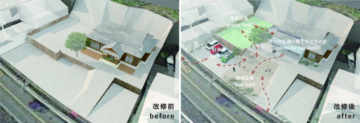 佐々木:また〈HOGET〉では、建物に加えて前面の外構も改修しています。もとは城の石垣のように内外を断絶する構えでしたが、その一部を解体し、高低差をなだらかにつなぎ直すことで、内外が連続する関係へと転換しました。その結果、人の営みが外部へとにじみ出ていくような地域交流の場となりました。