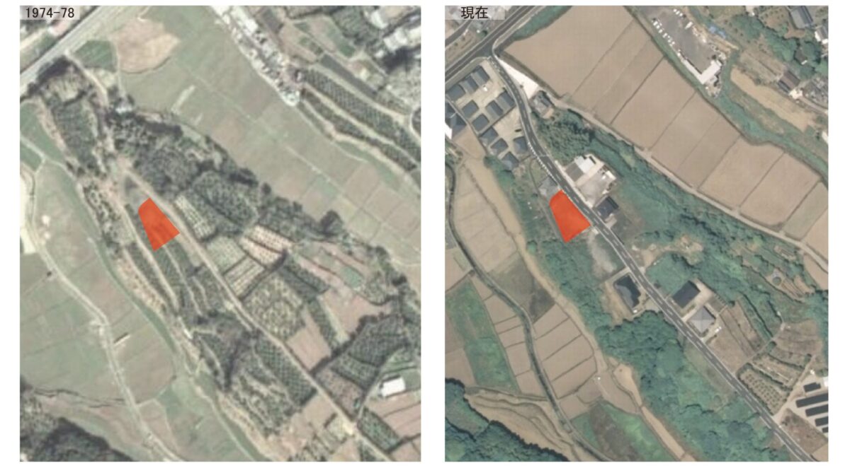 今回の敷地も、今でこそ平坦ですが、周辺の地形から本来は傾斜地であったことは明らかです。履歴を辿ると、1980年代ごろまでは小山状の地形を活かした果樹の段々畑が広がっており、その後、1990年代以降に尾根に沿って道路が整備され、それに接するかたちで盛土が行われ、現在にいたったと考えられます。